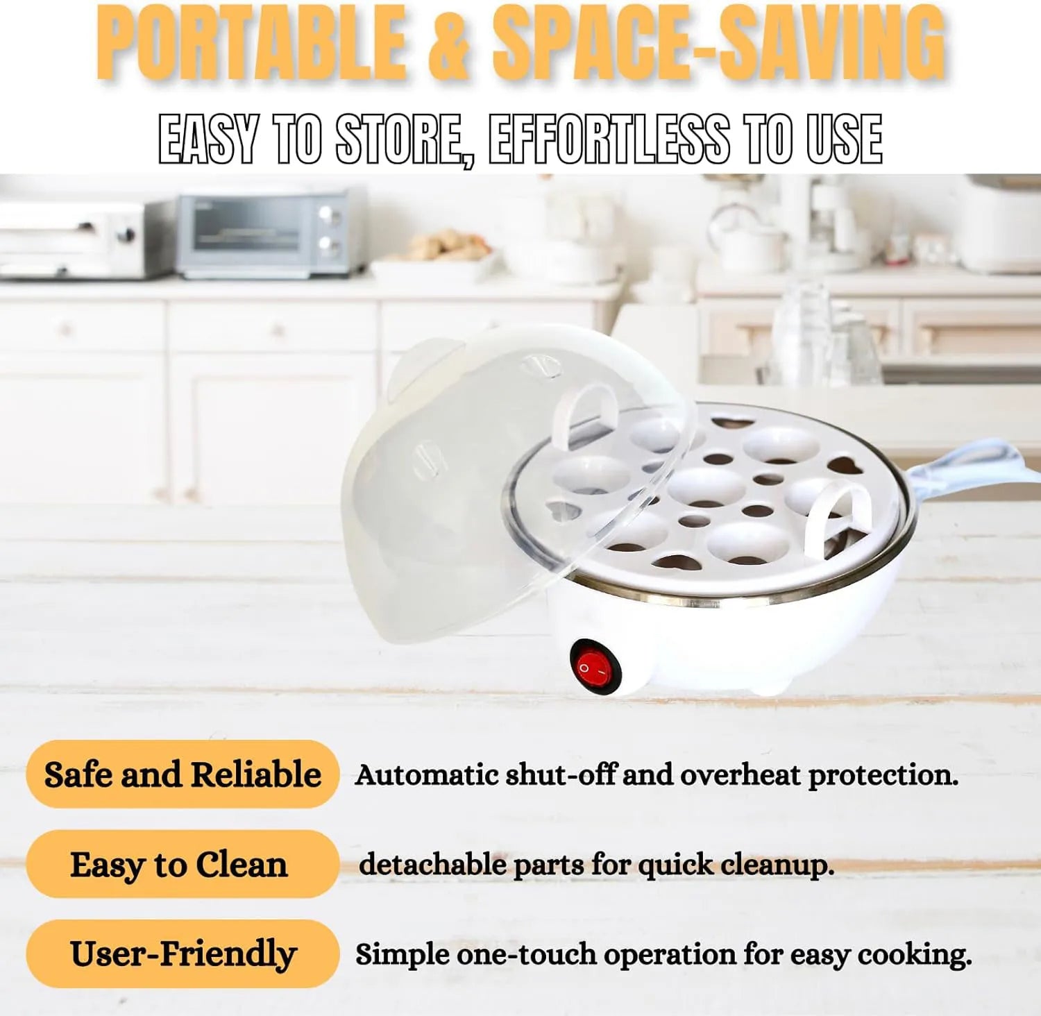 Säg adjö till överkokta ägg och brända pannor! Den inbyggda automatiska avstängningsfunktionen stänger av enheten när vattnet tar slut, vilket garanterar säkra, konsekventa resultat utan ständig övervakning.