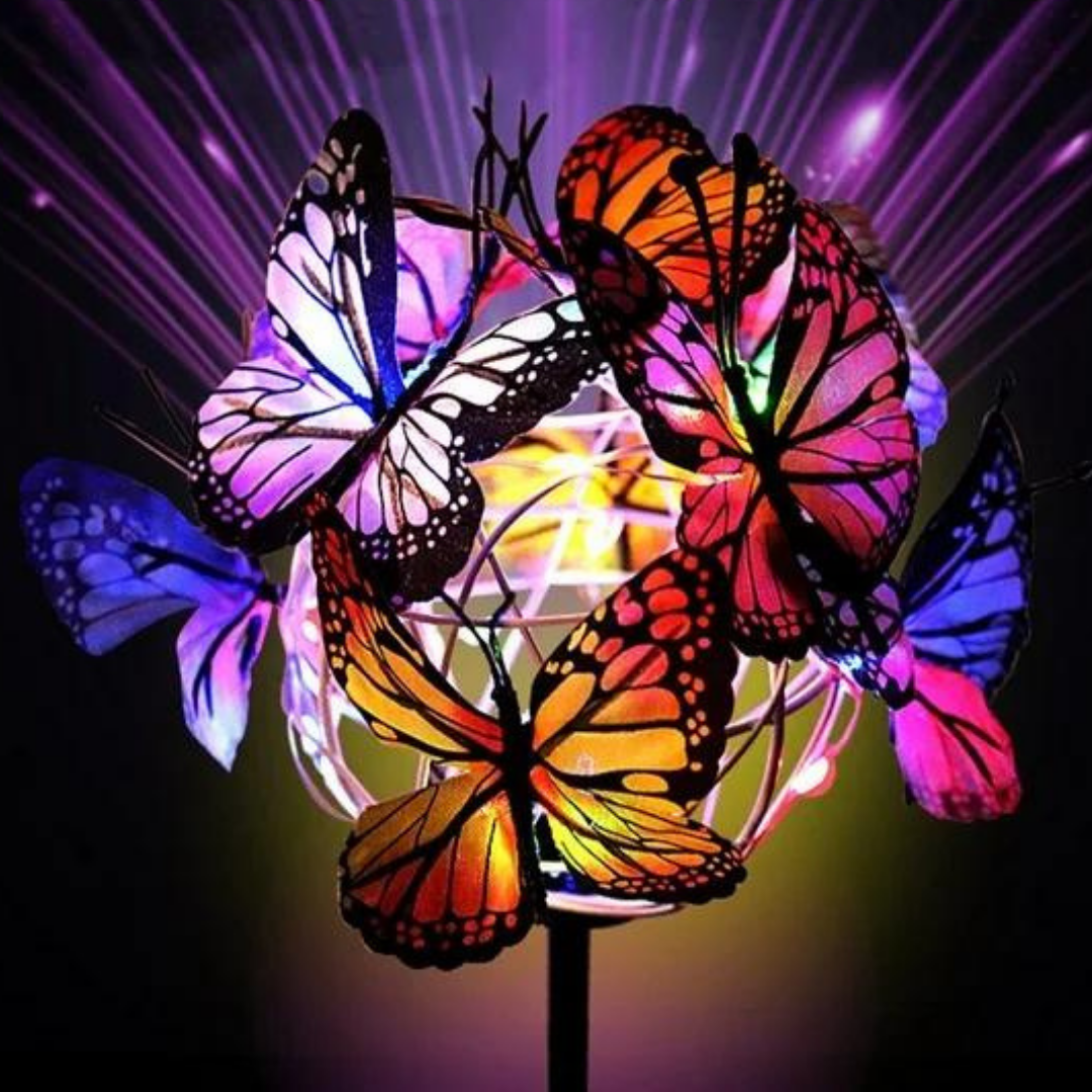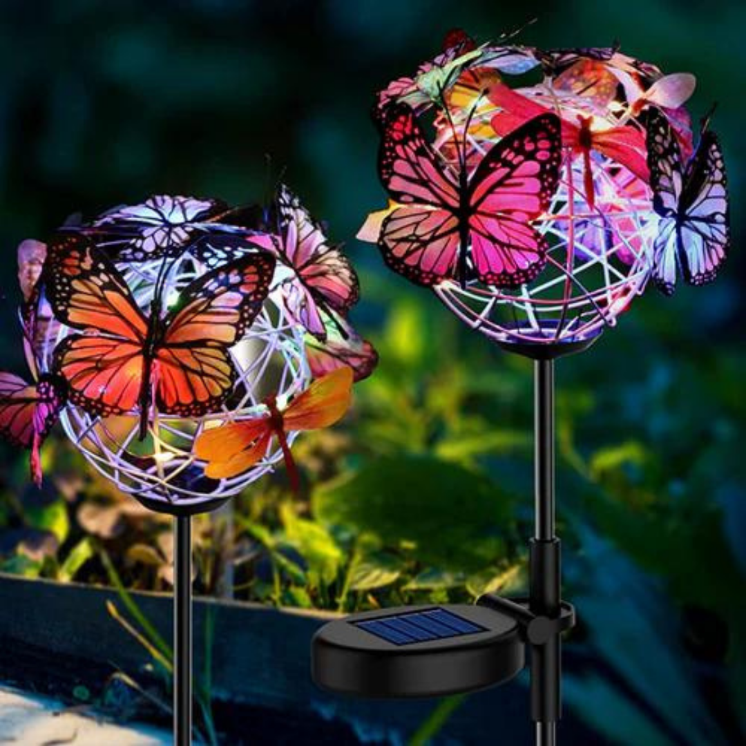 Ge din trädgård en livlig stämning med det gulliga och färgglada fjärilsparet! De är 100% solcellsdrivna och tillverkade av vädertåligt material, vilket gör dem till det perfekta tillskottet i din trädgård!