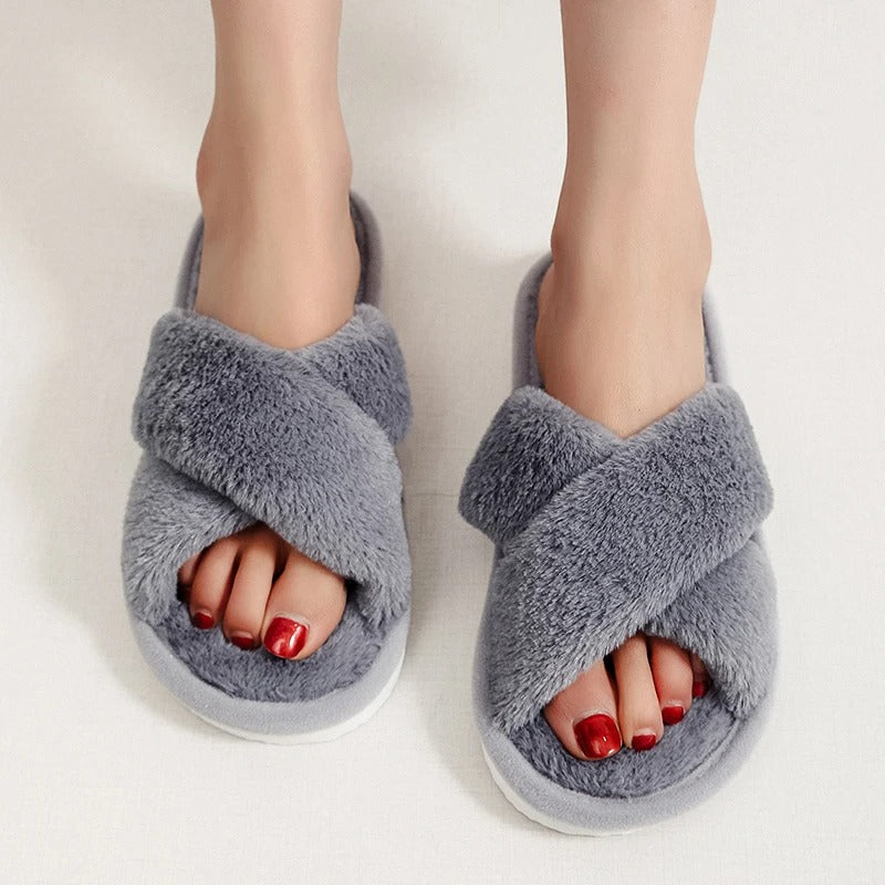 Den korsade designen av mjuk fuskpäls ger inte bara ett elegant utseende utan också en extra känsla av lyx. Den vadderade sulan erbjuder optimal stötdämpning, vilket gör varje steg lika bekvämt som det första. Halkfria sulor ger stabilitet på alla underlag, medan den öppna tådesignen låter dina fötter andas.