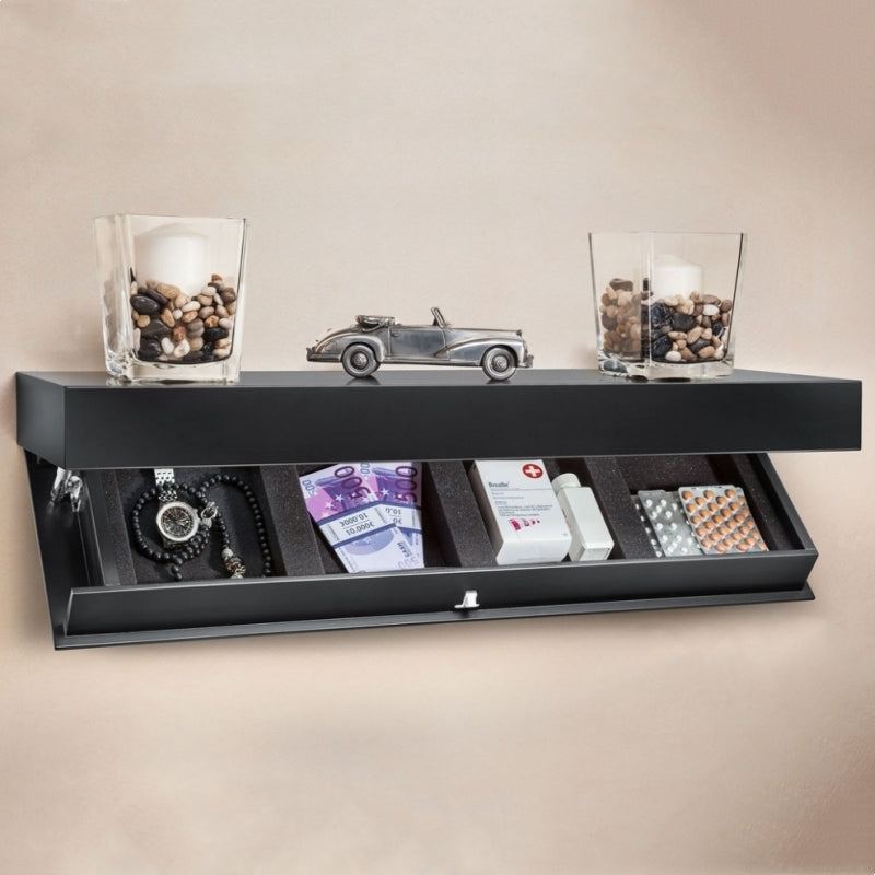Lägg till intriger i ditt hem med en väggmonterad flytande hylla som fungerar som en diskret förvaringslösning. Med sin moderna, minimalistiska design och smart dolda fack, håller den viktiga saker undan samtidigt som den erbjuder en ren, dekorativ känsla för vilket rum som helst.