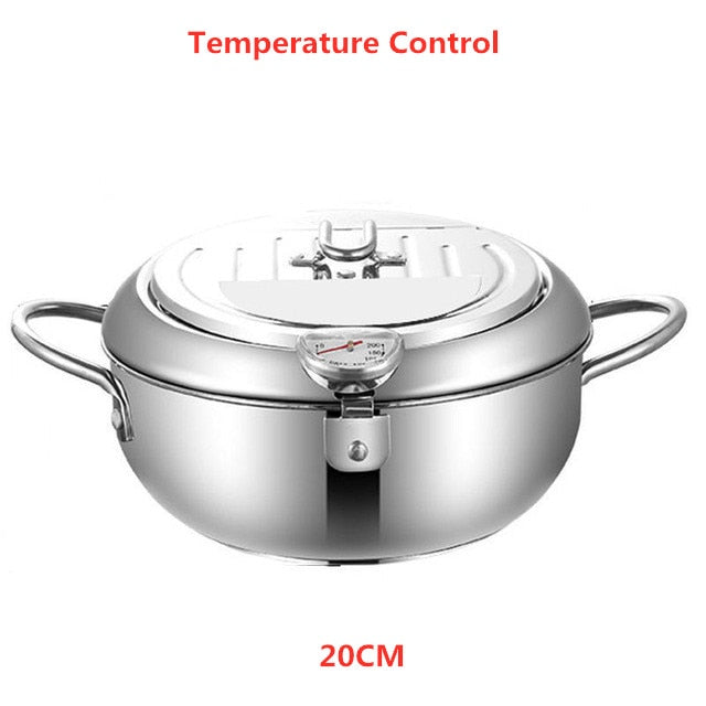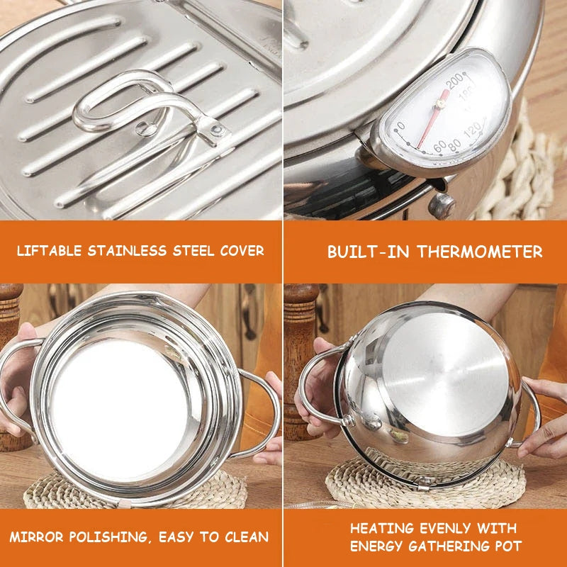 Fritös i rostfritt stål – tempurapanna med lock och inbyggd termometer