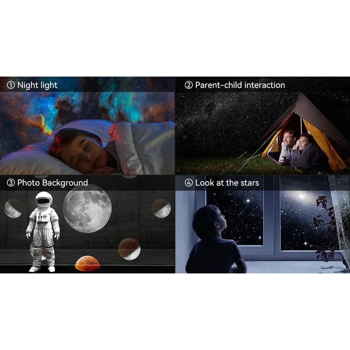 Förvandla ditt utrymme med nattljus galaxprojektorn, ett fantastiskt sätt att ta med universums underverk in i ditt hem. Oavsett om du vill skapa en avslappnande atmosfär i ditt sovrum, förbättra din hemmas bioupplevelse, eller inspirera en känsla av förundran för både barn och vuxna, levererar denna galaxprojektor en fördjupande och magisk ljusshow. Med 12 fängslande projektionfilmer kan du utforska solsystemet, Vintergatan, Andromedagalaxen och mer, allt från komforten av ditt rum.