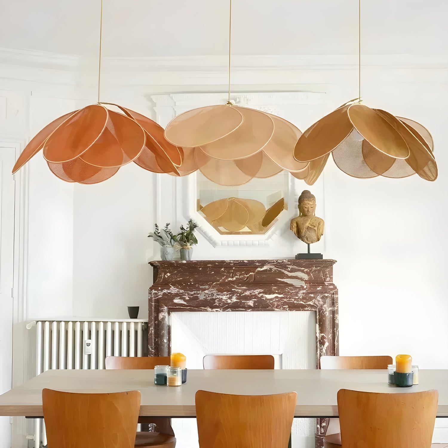 Hänglampa med tygblommor – Modern, dekorativ belysning för vardagsrum
