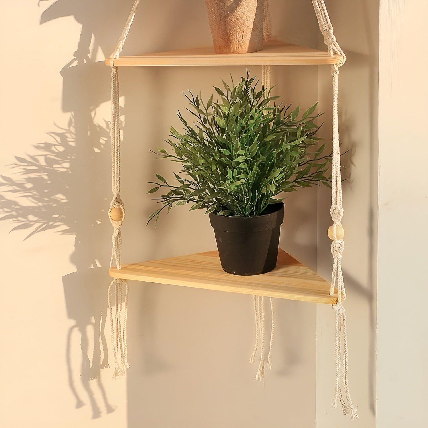 Är du trött på att dina väggar ser tråkiga och livlösa ut? Säg adjö till tråkiga väggar och välkomna en chic, bohemisk atmosfär med vår handgjorda Hängande vägghylla. Denna triangulära hänghylla i trä, som noggrant tillverkas av lokala hantverkare, ger en touch av naturen till ditt hem och förvandlar varje rum till en mysig oas. Med sin minimalistiska charm passar den in i alla inredningsstilar: rustik, boho, modern eller minimalistisk!