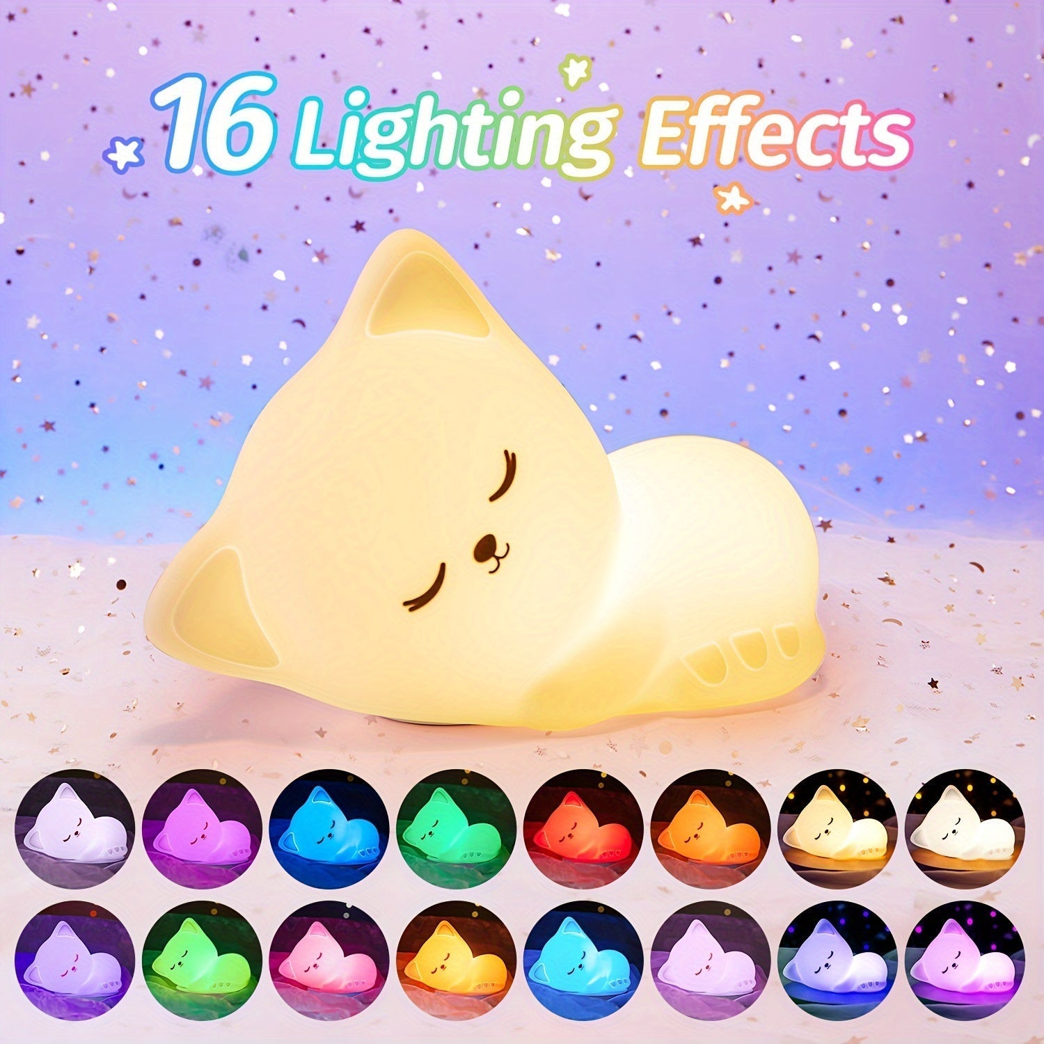 KittyGlow Nattlampa är en charmig och funktionell belysning för varje utrymme. Med en söt kattdesign, 16 färgalternativ och en mjuk silikonlampakåpa är den perfekt för sovrum, kontor, hotell och mer. Styra ljuset är enkelt med den medföljande fjärrkontrollen, justera ljusstyrkan och ställ in timer för ultimat bekvämlighet. Det USB-laddningsbara batteriet gör den sladdlös och enkel att använda, vilket gör den idealisk som julklappar eller festdekorationer.