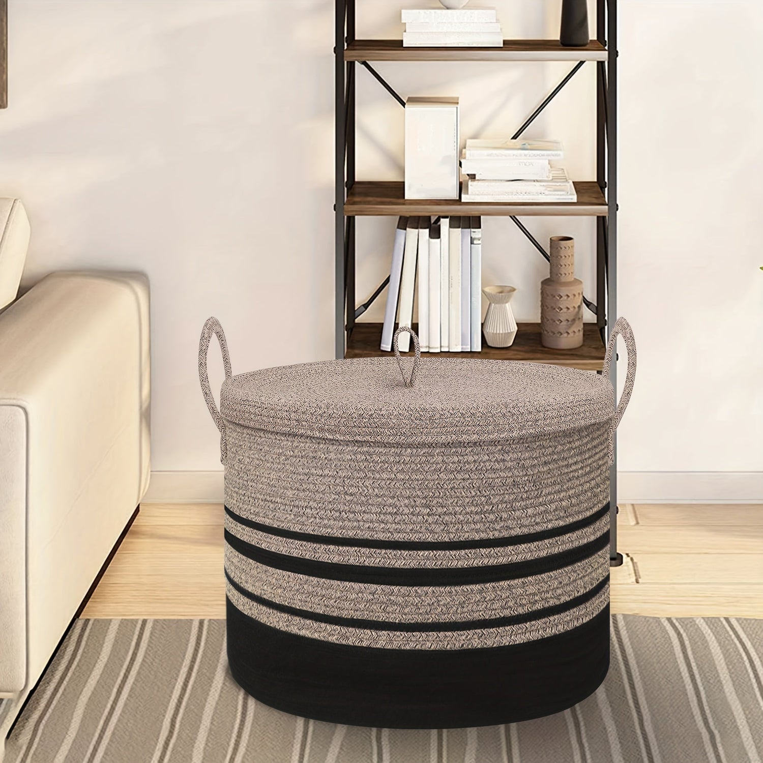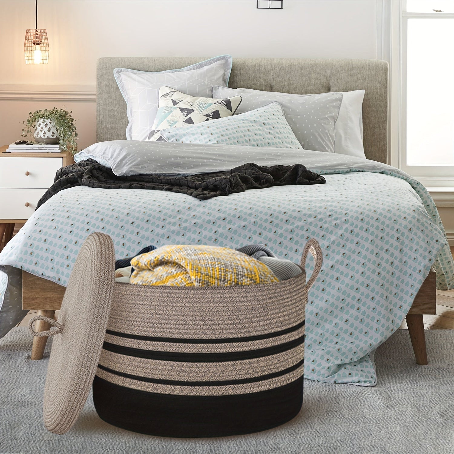 Denna klassiska förvaringskorg med lock erbjuder den perfekta lösningen för att förvara filtar, kuddar eller leksaker i ditt vardagsrum, sovrum eller badrum. Det robusta vävda materialet och praktiska locket håller dina saker dammfria och snyggt förvarade. Korgen har bekväma handtag för enkel transport och passar perfekt in i vilken inredning som helst.