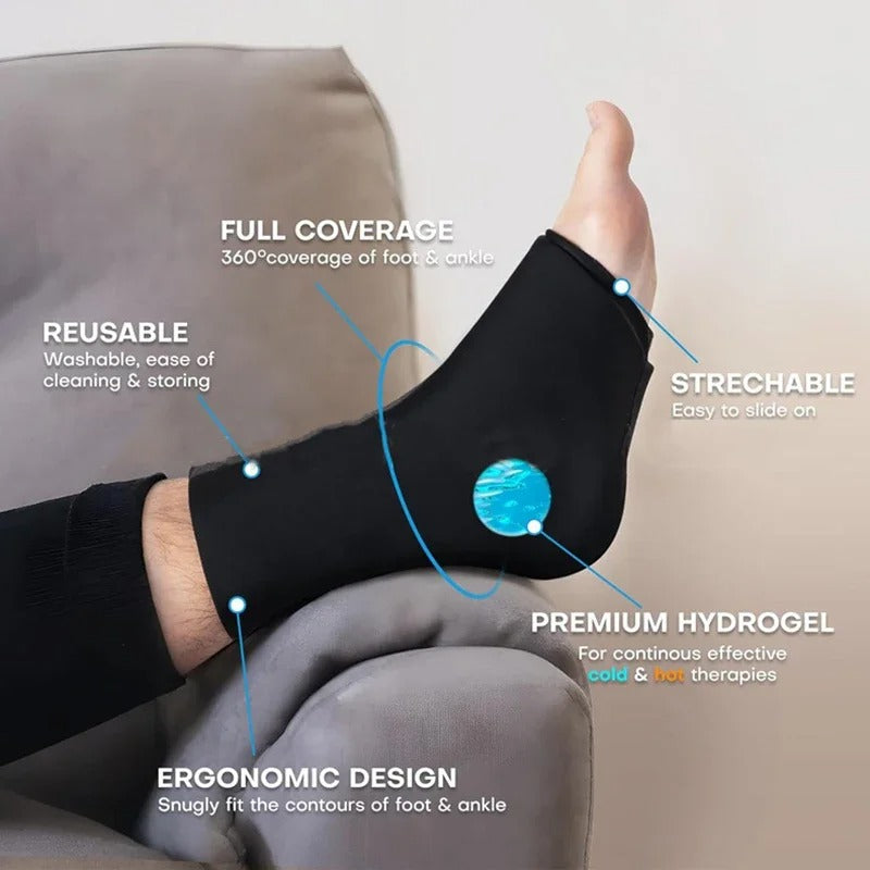 Återanvändbar gelkompress för foten – perfekt för både kall och varm behandling. Lindrar effektivt smärta vid hälseneinflammation, plantar fasciit, stukningar, svullnad eller ömma fötter.