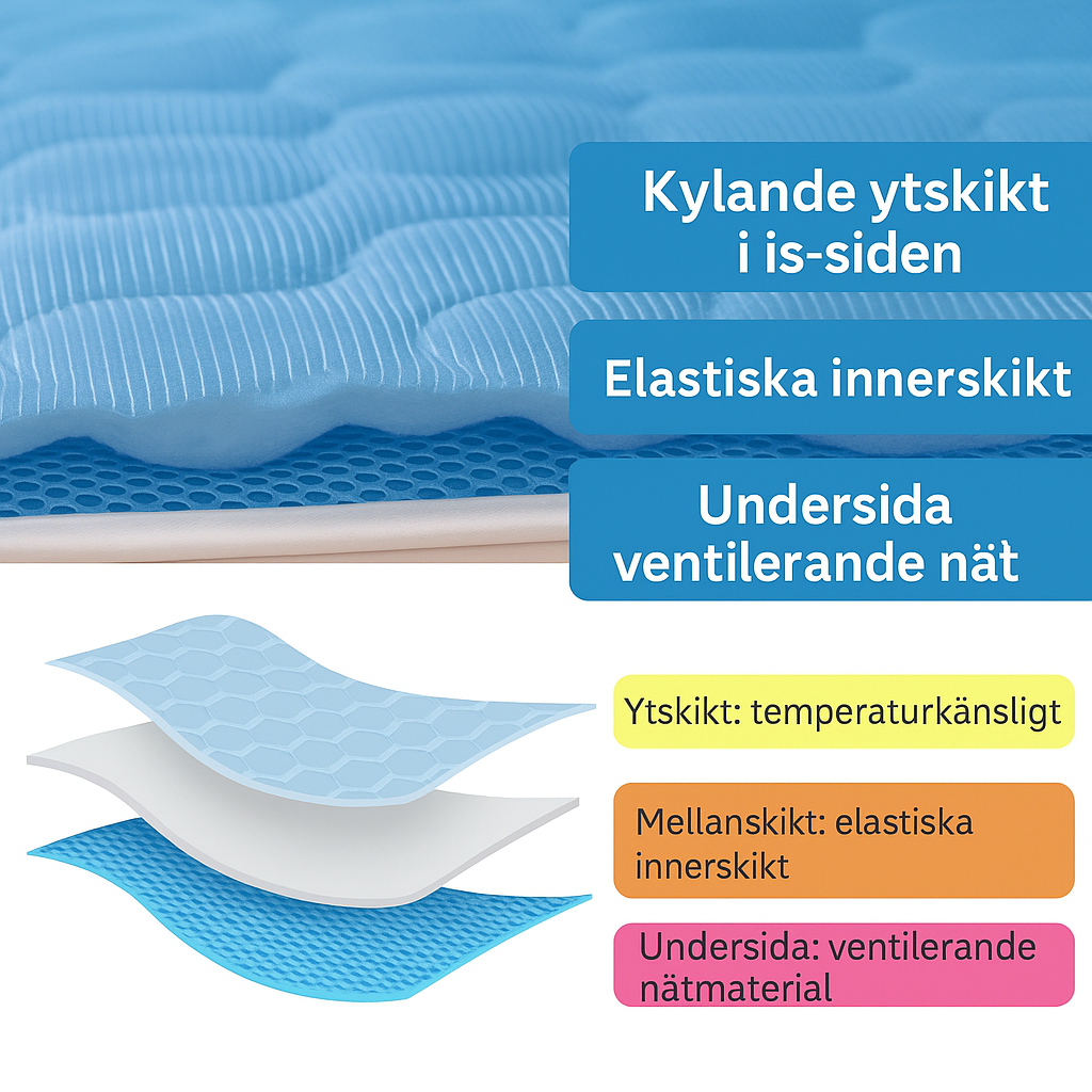 Till skillnad från vanliga kylmattor som kräver förberedelser, använder denna dyna en självkylande teknologi genom specialutvecklade värmeavvisande fibrer. Den ger en omedelbar svalkande effekt utan vatten, kylgel eller elektricitet. Det innebär att dynan alltid är redo att användas – perfekt för både hemmet och resor.