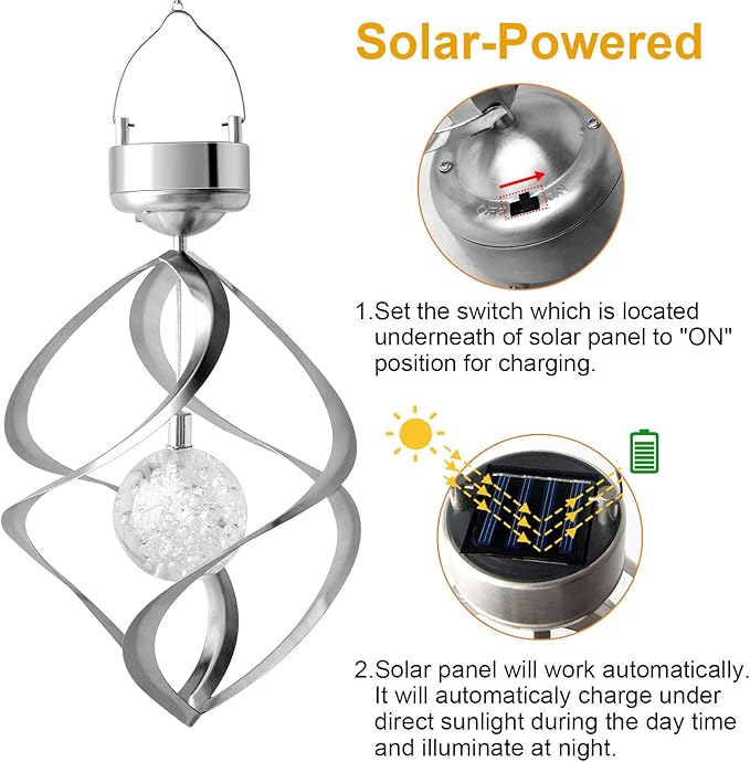 • 🌞 Solenergi: Vindspelet laddas upp under dagen med solenergi och lyser automatiskt på natten, helt utan extra elkostnader.