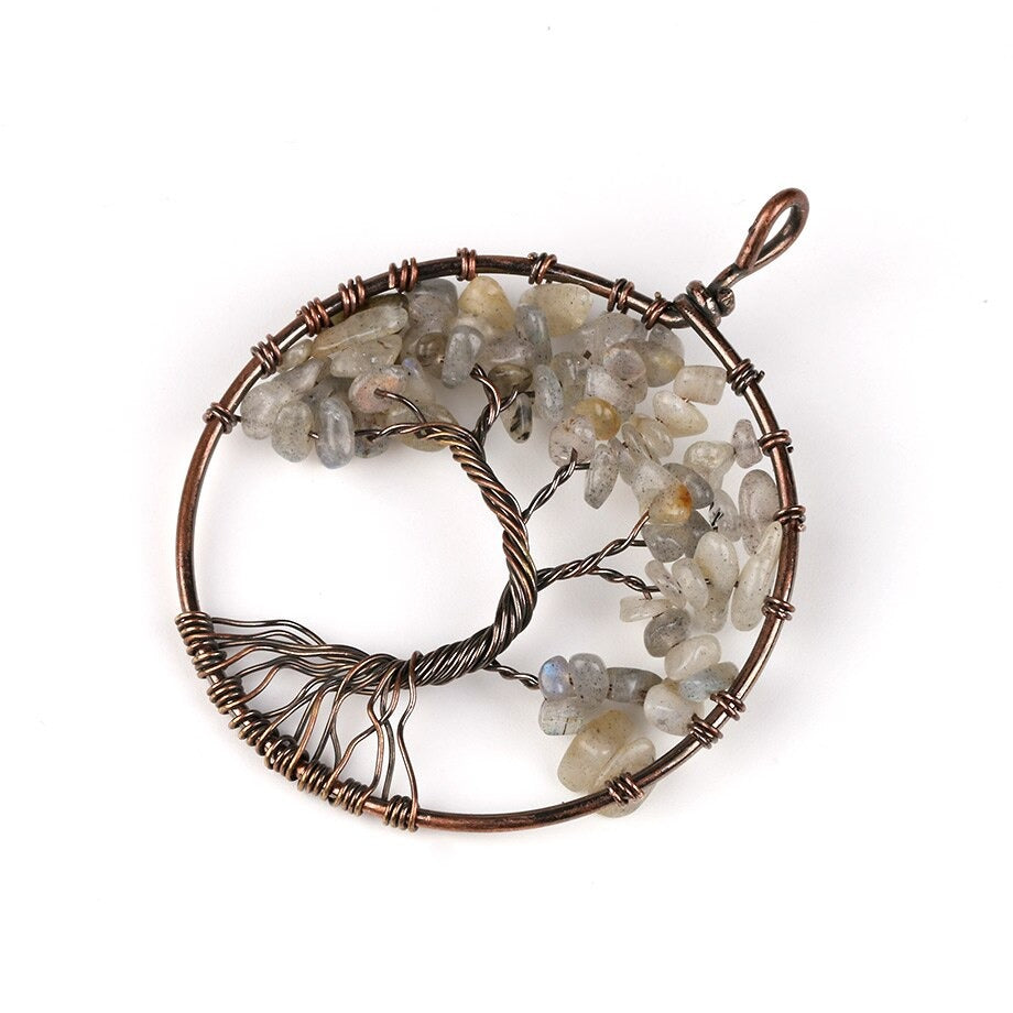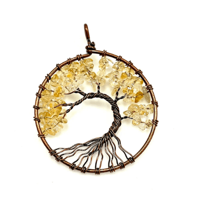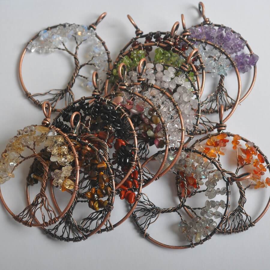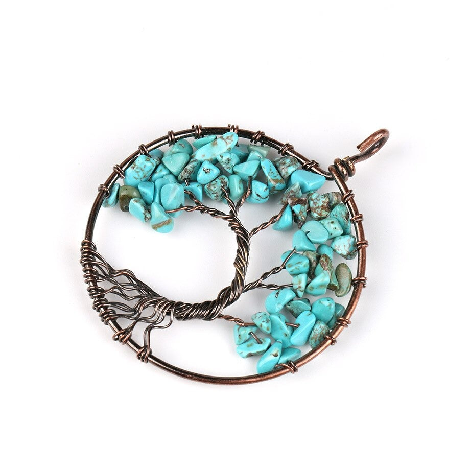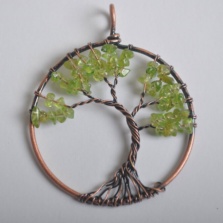 Livets träd är en symbol för kopplingen mellan himmel och jord och verkar ge bäraren en känsla av lugn. De vackra rika naturliga färgerna på dessa pärlor kontrasterar så naturligt med den antika koppartråd som de är lindade med.