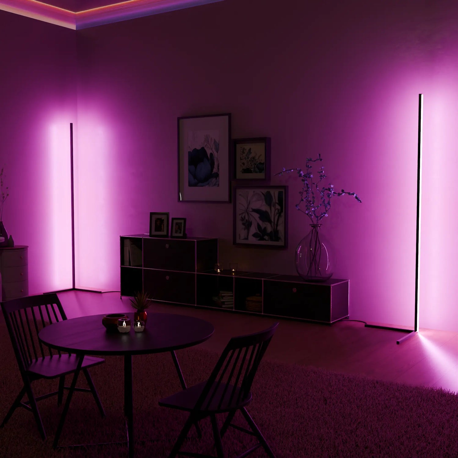 Denna moderna golvlampa ger ett stiligt och stämningsfullt ljus till varje rum. Med sin eleganta design och mångsidiga färginställningar är den perfekt för att skapa den önskade atmosfären, oavsett om det är för en mysig kväll eller en livlig sammankomst. Denna lampa är idealisk för användning i vardagsrum, sovrum eller hemmakontor och ger en samtida touch till ditt inre. Njut av den perfekta belysningen för varje tillfälle med denna vackra golvlampa.