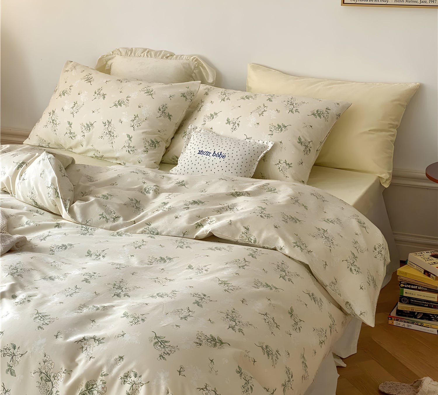 Setet LushPetal – Elegant blommigt sängklädset tar den skönhet av en blomstrande trädgård direkt till ditt hem. Med sitt ömtåliga blommönster i mjuka blå och pastellgula toner ger det ditt rum en fräsch och lugnande atmosfär. Tillverkat av 100% högkvalitativ bomull, erbjuder detta set inte bara en estetisk höjdpunkt utan också en mjukt och andningsbart sömnkomfort.