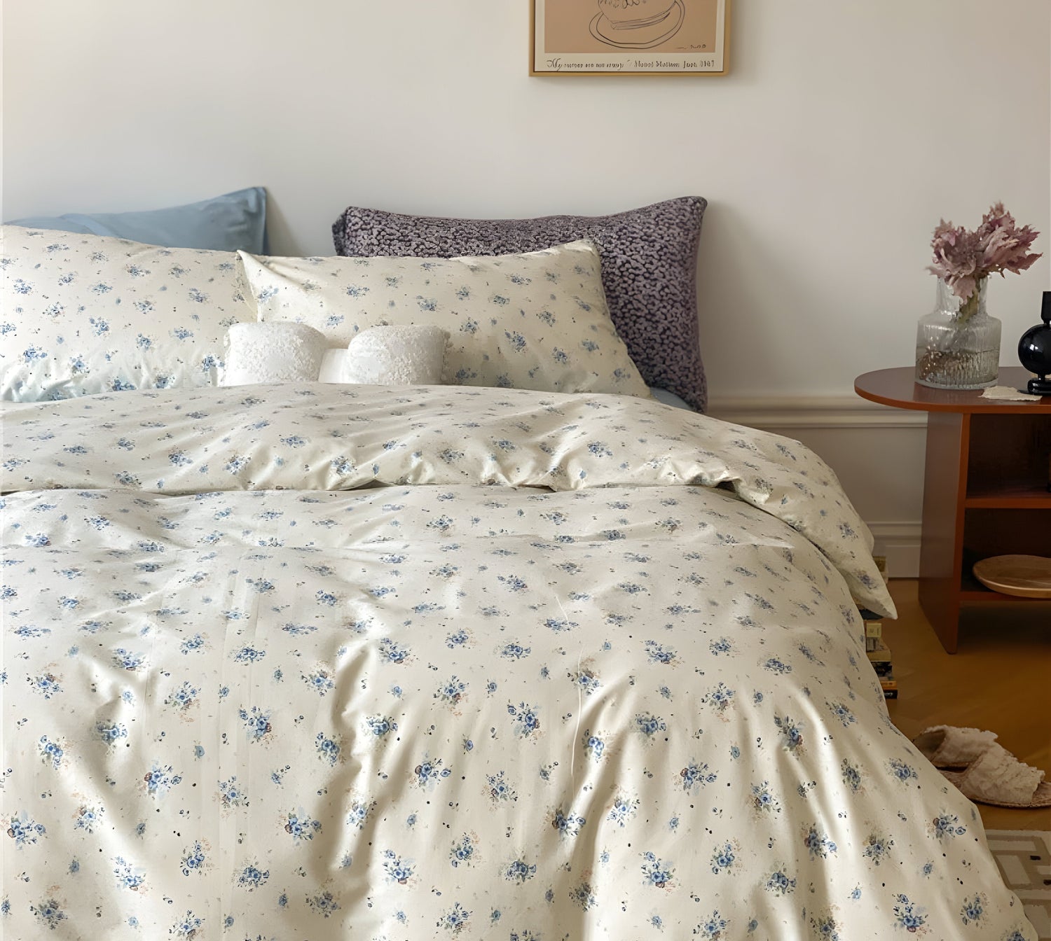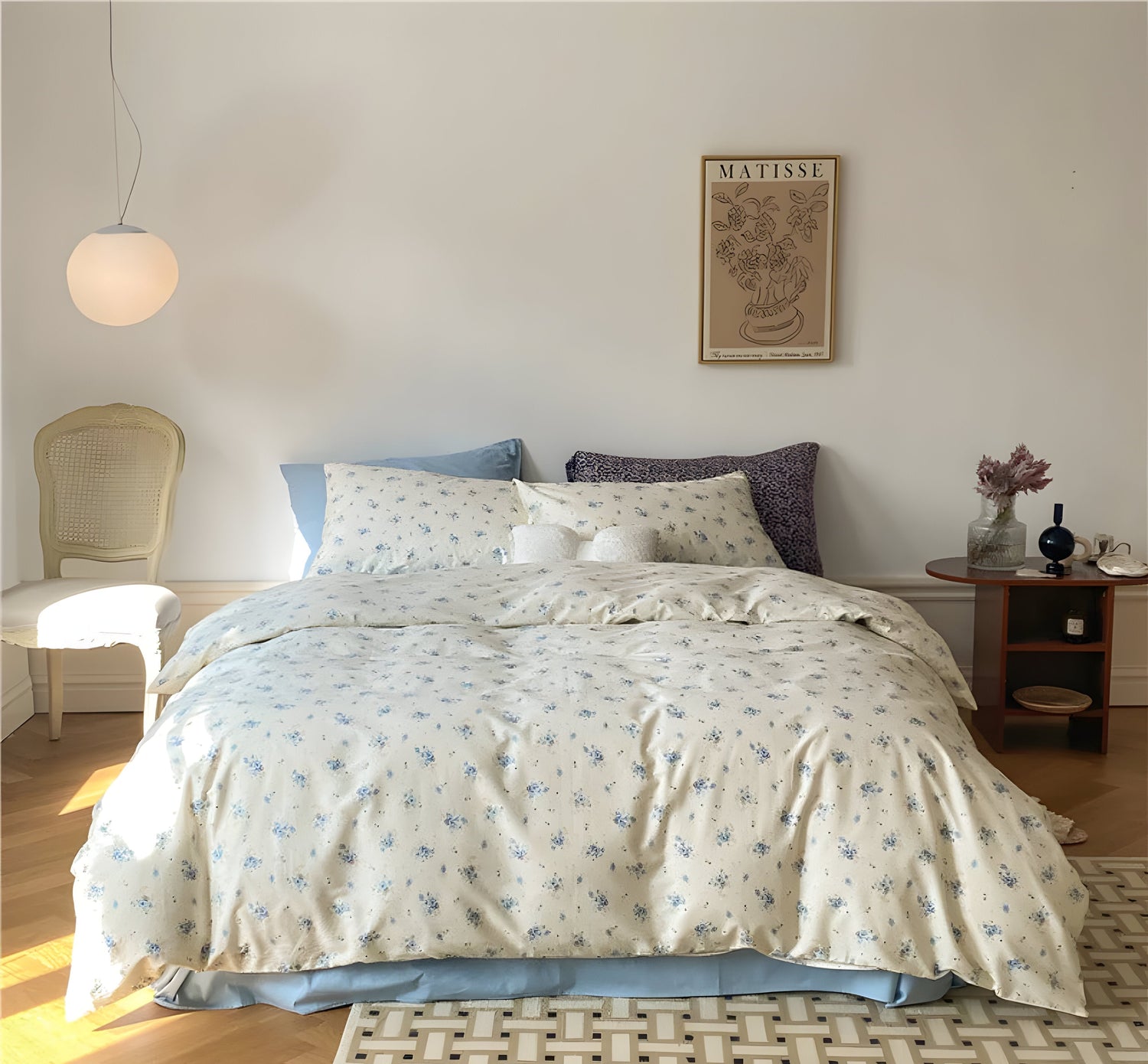 Det blommiga mönstret i blått och pastellgult ger ett inslag av natur till ditt sovrum. -