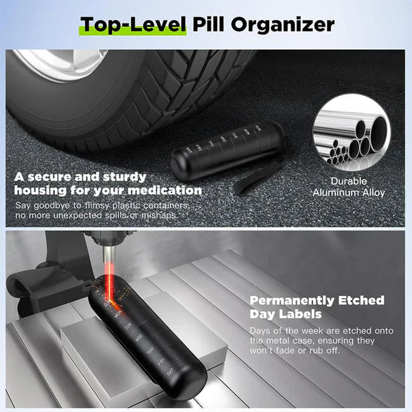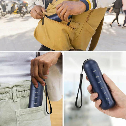 Håll koll på din medicinrutin med denna hållbara, vattentäta och bärbara pillerorganisatör designad för din aktiva livsstil.