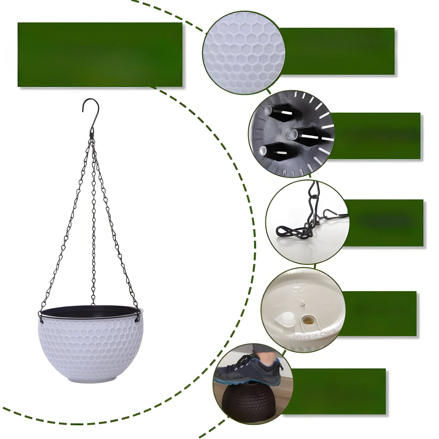 Med den medföljande kroken kan blomkrukan enkelt hängas upp. -