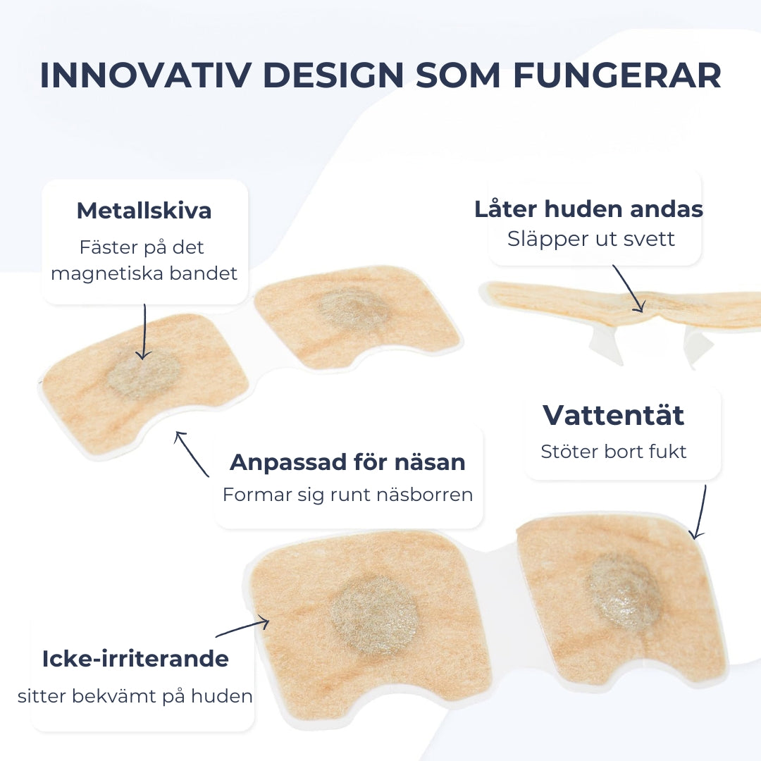Förbättra din andning och minska snarkning med magnetisk näsvidgare som vidgar näsgångarna. Perfekt för nattsömn, träning och allergibesvär. Setet innehåller en 15-dagars förbrukning med näsremsor och magnetisk näsvidgare för enkel applicering.
