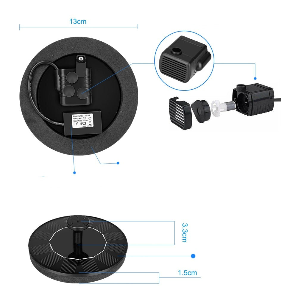 - SOLAR-DRIVNA: Mini Solar Splash Fountain drivs av solenergi, vilket eliminerar behovet av elektriska ledningar eller batterier. Denna miljövänliga funktion gör att du kan njuta av det lugnande vattenflödet utan några extra kostnader eller problem.
