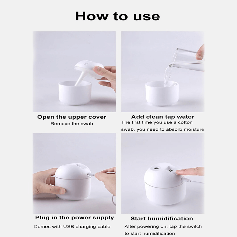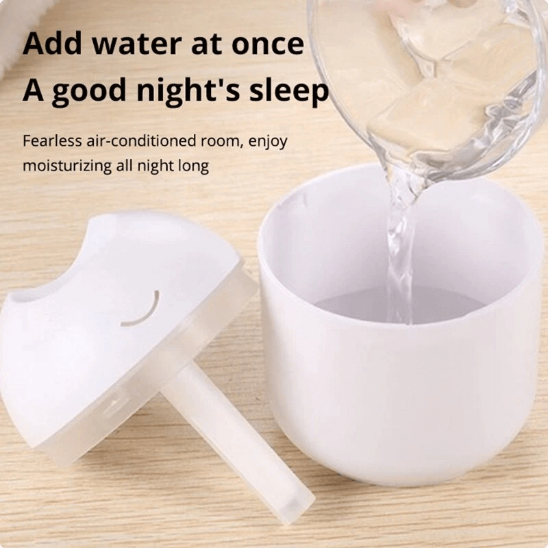 Minifukthumidifier tillsätter fukt till luften, vilket kan hjälpa till att fukta huden och främja en mer avkopplande nattsömn.