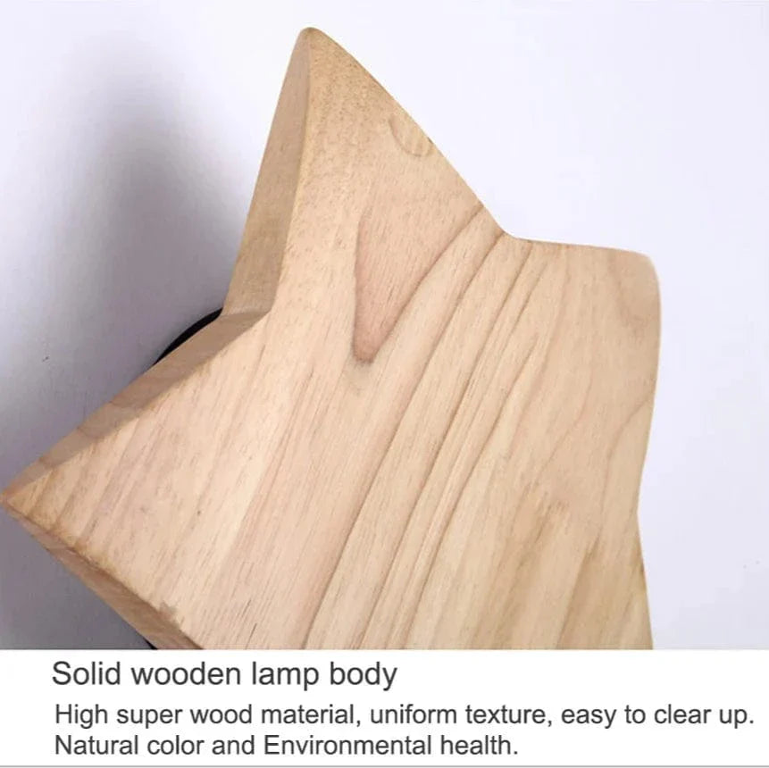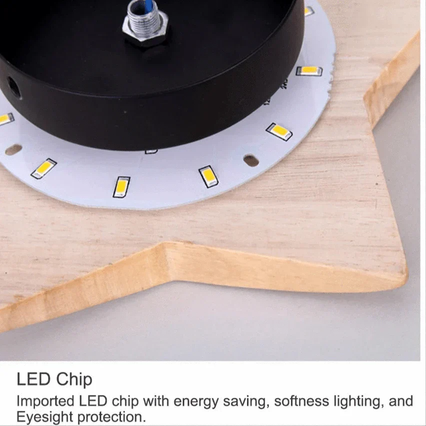 Denna moderna stjärnformade vägglampa kombinerar massiv trä och järn för en unik belysningslösning, perfekt för vardagsrum, korridorer och sovrum. Med sin charmiga design förbättrar den atmosfären samtidigt som den ger praktisk belysning.