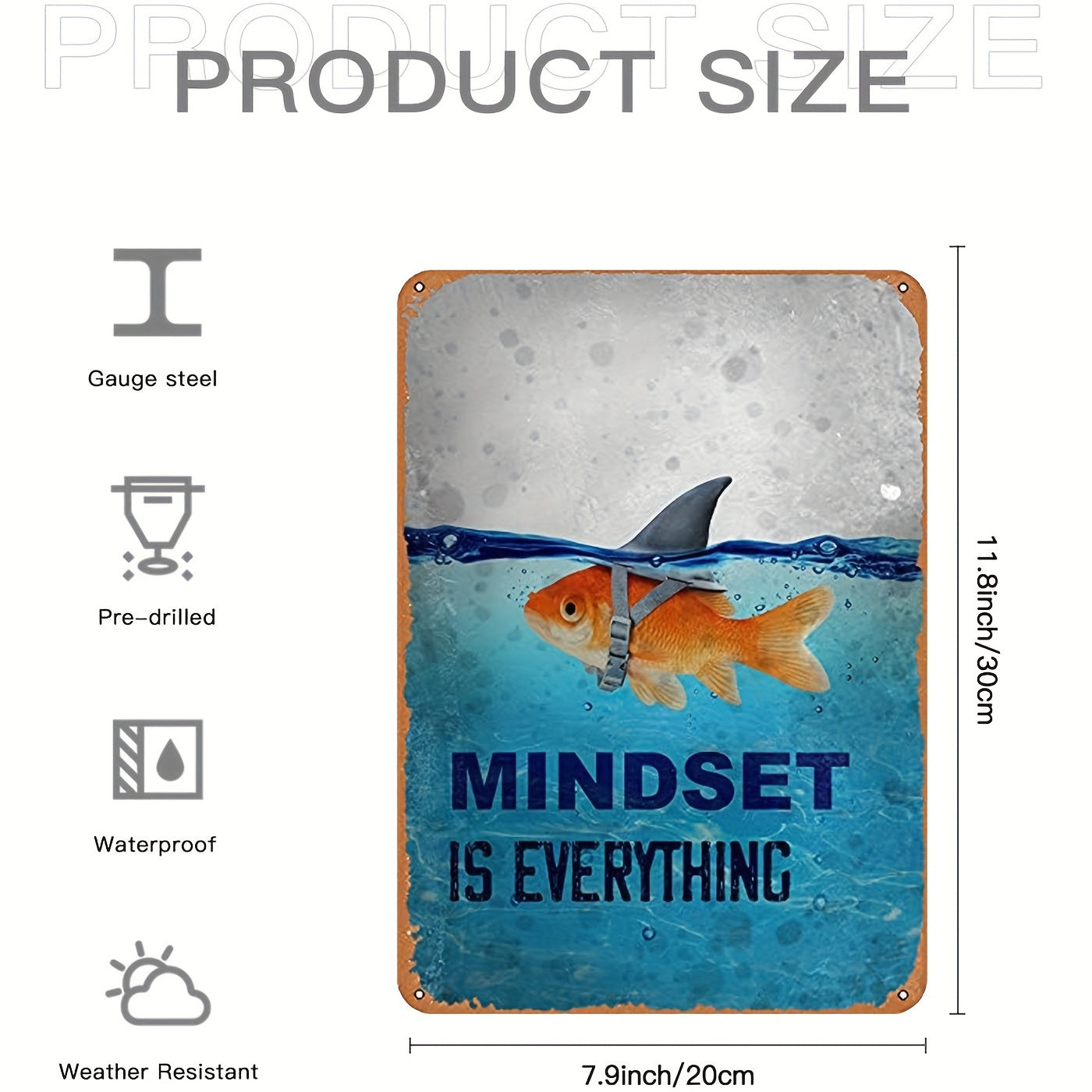 Lägg till en inspirerande touch till ditt inre med denna unika metallskylt som har budskapet "Tankesättet är allt." Denna iögonfallande design, med en lekfull bild av en guldfisk med en hajfena, väcker inte bara diskussioner utan fungerar också som en påminnelse om vikten av ett positivt tankesätt. Perfekt för vilket utrymme som helst, vare sig hemma eller på kontoret, denna skylt ökar motivation och kreativitet. Det är en fantastisk present till vänner eller kollegor som kan behöva en extra push.