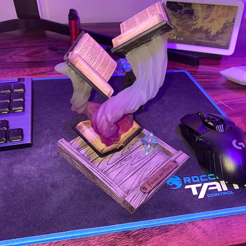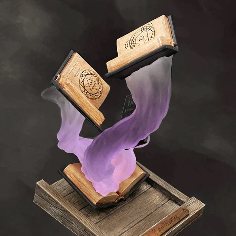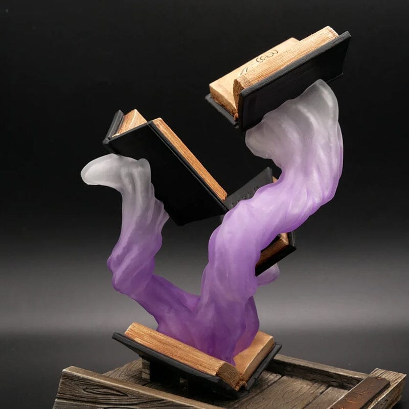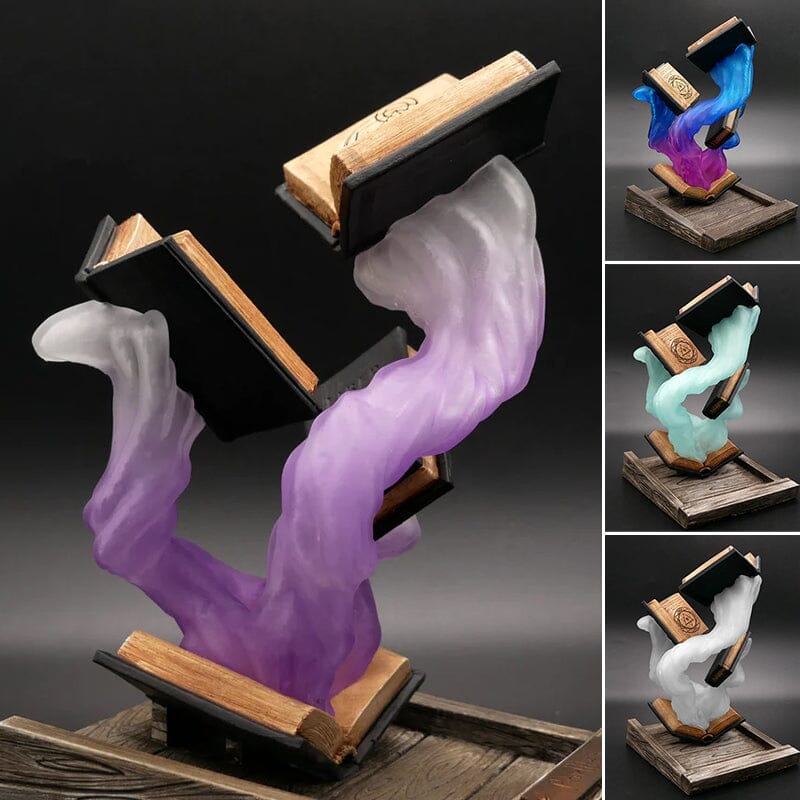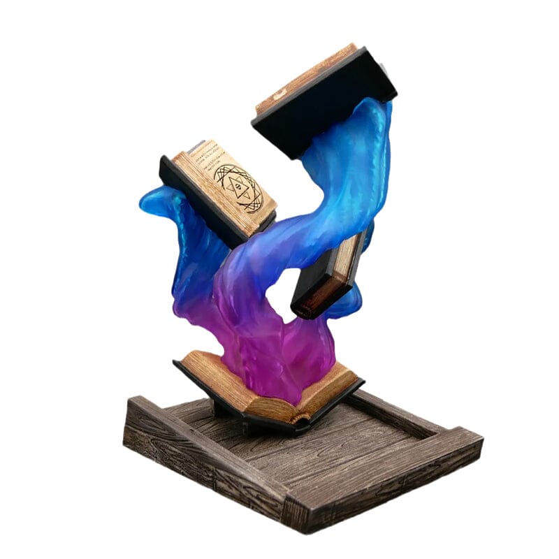 Runt böckerna finns en färgglad, virvlande dimma som förstärker känslan av rörelse och förundran. De skiftande nyanserna skapar en fascinerande visning, vilket gör den till ett perfekt val för dem som älskar fantasy-inspirerad inredning. Oavsett om den placeras på ett skrivbord, en hylla eller som en del av en temainredning, ger den en kreativ och magisk känsla till vilket rum som helst.