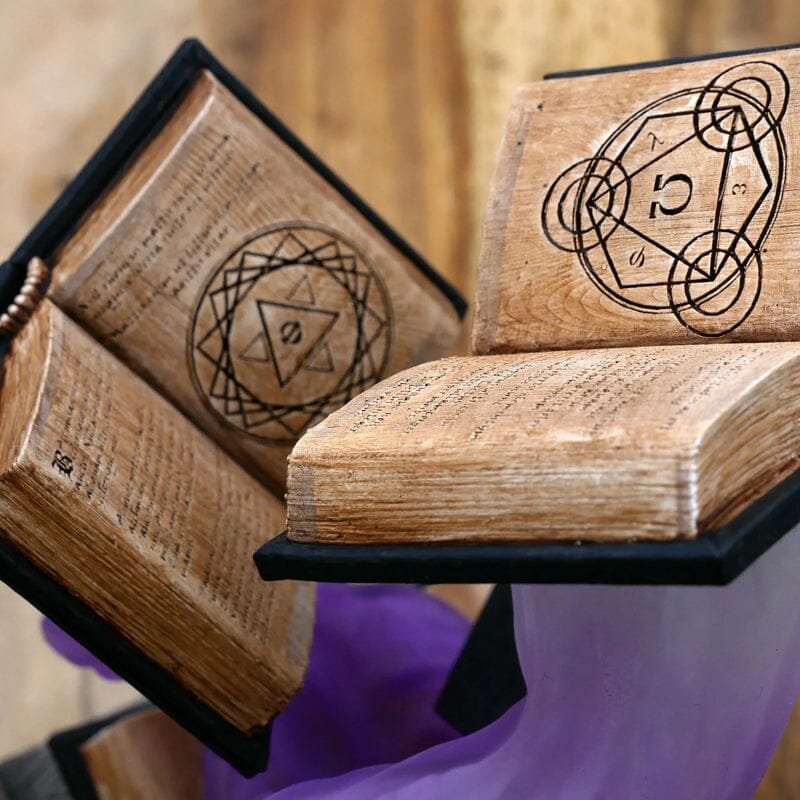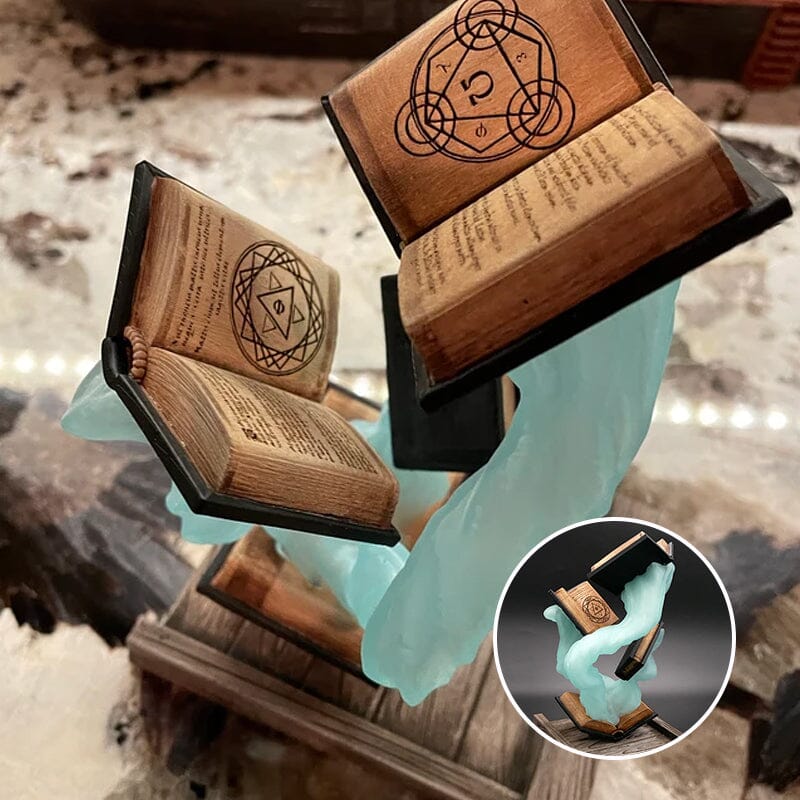 Detta dekorativa stycke har två öppna böcker som ser ut att sväva över en bas, vilket skapar en fascinerande illusion. De detaljerade sidorna visar mystiska symboler och text i gammal stil, vilket ger en förtrollande känsla. Dess iögonfallande design gör den till ett fantastiskt tillskott i vilket rum som helst.
