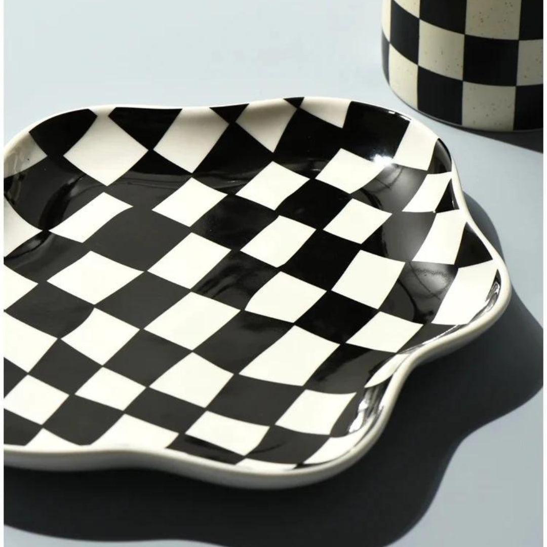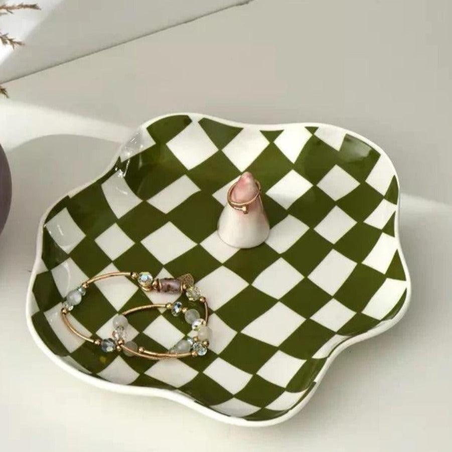 NinonCloud ger ditt rum en touch av personlighet med sin molninspirerade form och det djärva rutiga mönstret. Denna dekorativa skål finns i slående svart och vitt eller mjukt grönt och tillför visuell flair till byråer, skrivbord eller sidobord. Oavsett om du använder den för nycklar, smycken eller snacks, är det en funktionell accentbit som alltid sticker ut.