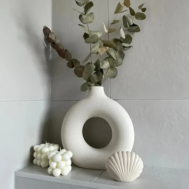 Detta set av ekologiska vaser ger en harmonisk balans mellan rustik enkelhet och modern design till ditt hem. Den runda designen med ett öppet centrum ger dessa vaser ett unikt och förfinat utseende, perfekt för torkade blommor eller som minimalistiska dekorativa föremål. Den naturliga finishen ger ett varmt, jordnära utseende, perfekt för att skapa en lugn atmosfär. Den största fördelen är den mångsidiga och tidlösa designen som passar in i vilken inredning som helst.