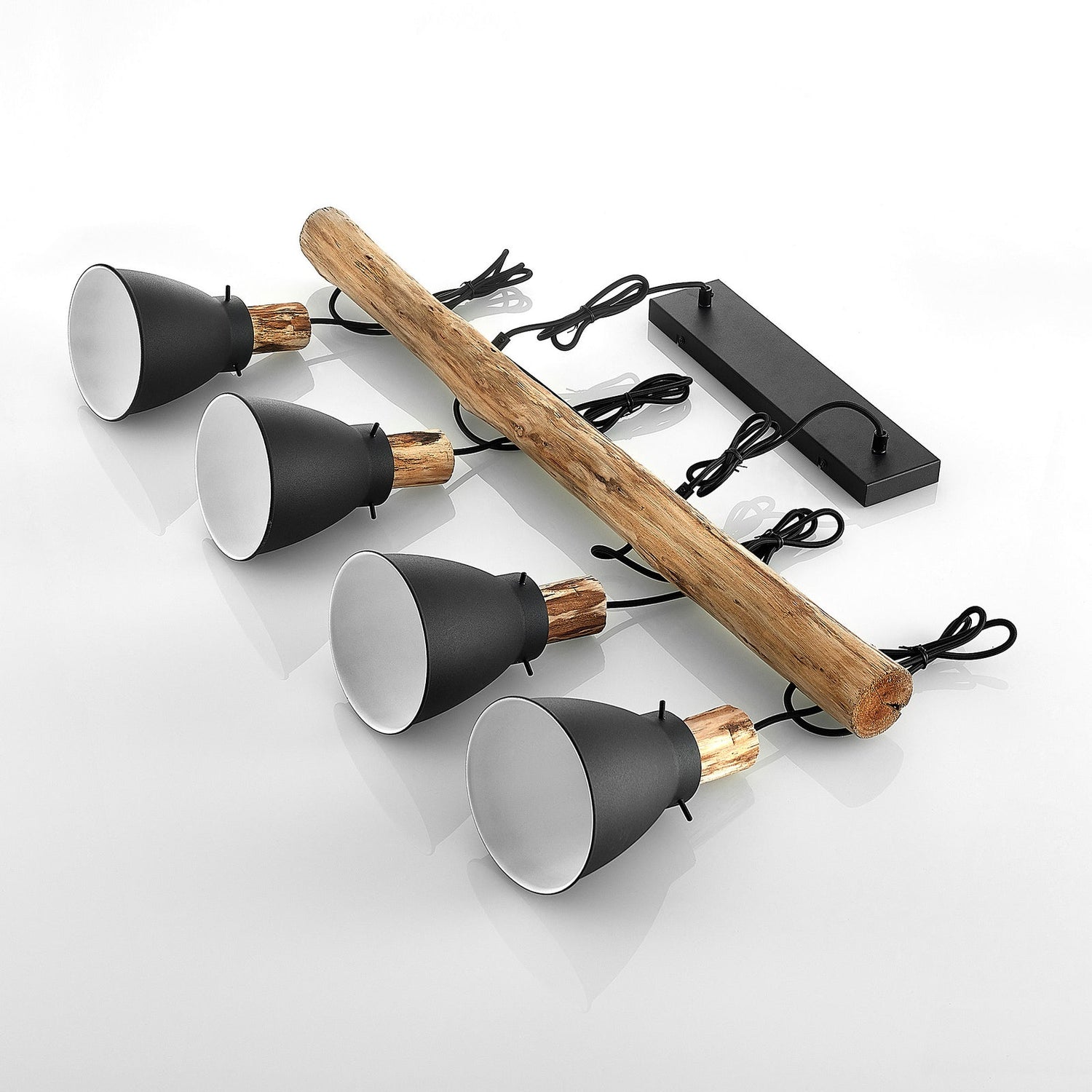 Pendellampa med en stilren blandning av rustik trä och svart metall, designad för att ge värme och karaktär till ditt hem. Denna 4-lamps hängande taklampa är perfekt för att lysa upp matbord, köksöar eller vardagsrum. Den flexibla designen låter dig justera varje metallskärm individuellt genom att linda kablarna runt eukalyptusträstången. Kompatibel med alla typer av glödlampor, inklusive energieffektiva LED-lampor, har den även vita skärminteriörer för optimal ljusreflektion och ljusstyrka.