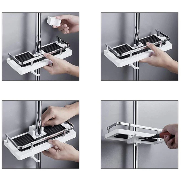 Tillverkad av högkvalitativa, vattentåliga material, tål hyllan utan problem fukt och daglig användning. Den enkla monteringen utan borrning gör den idealisk för hyreslägenheter eller snabba ombyggnader. Den kan flexibelt fästas på duschstången eller väggen och anpassar sig efter dina behov.