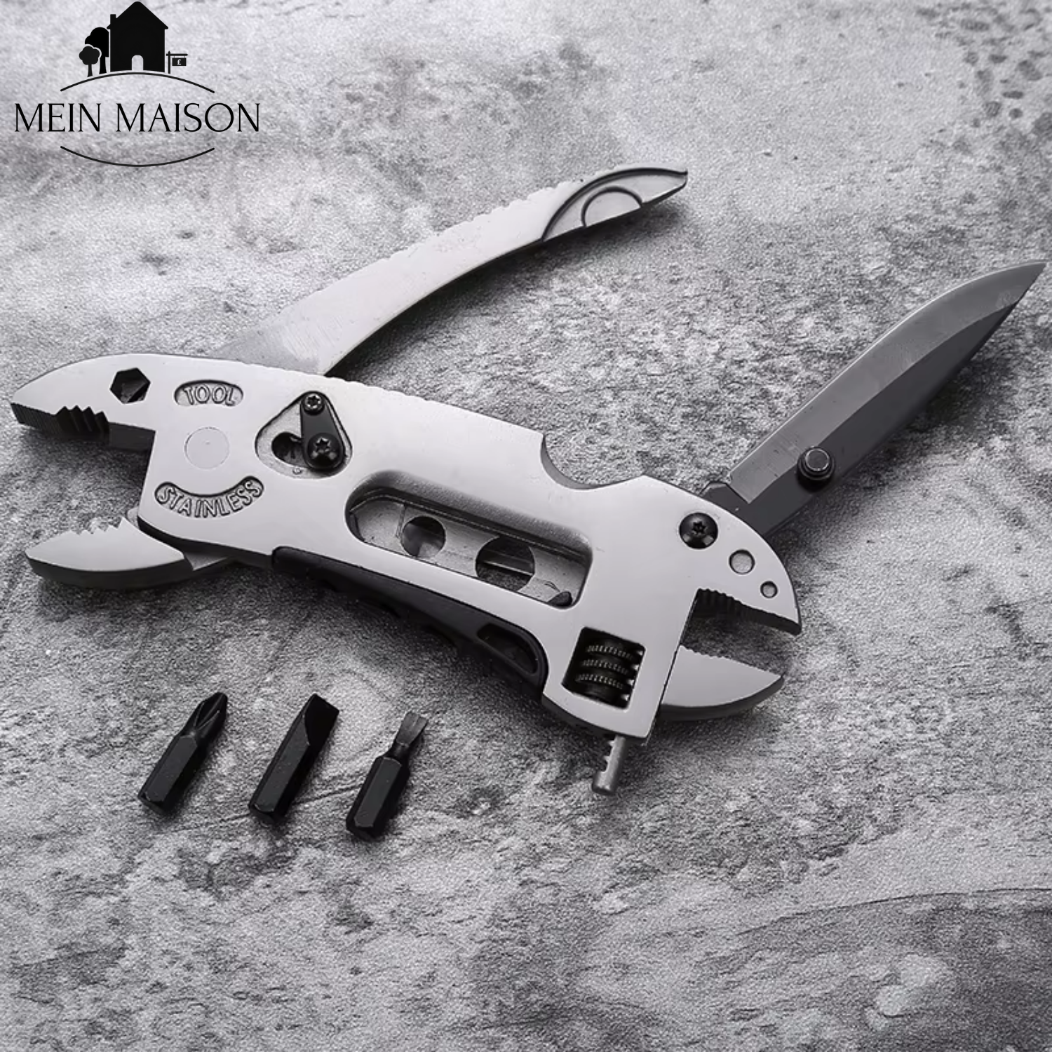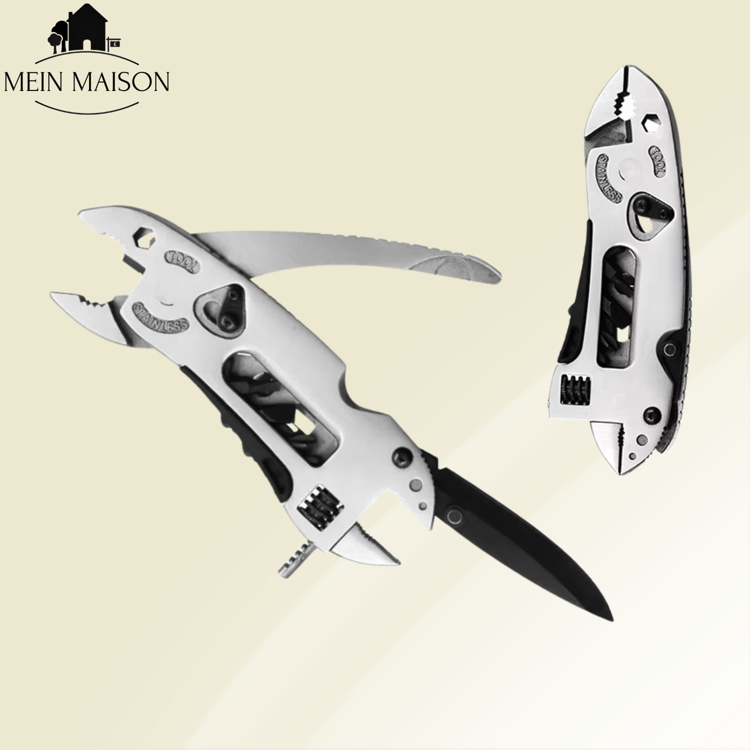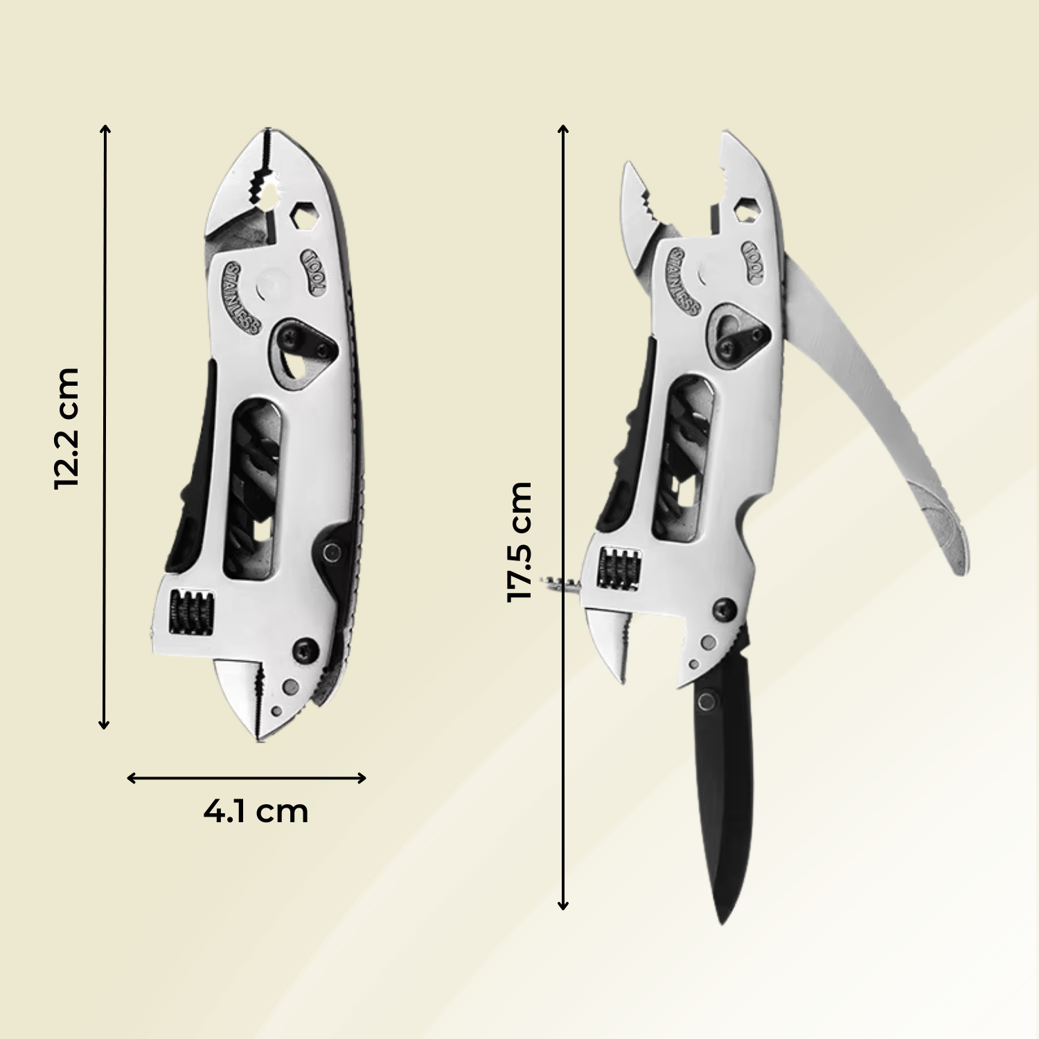 Tång, kniv, skruvmejsel, nyckel och andra praktiska funktioner.