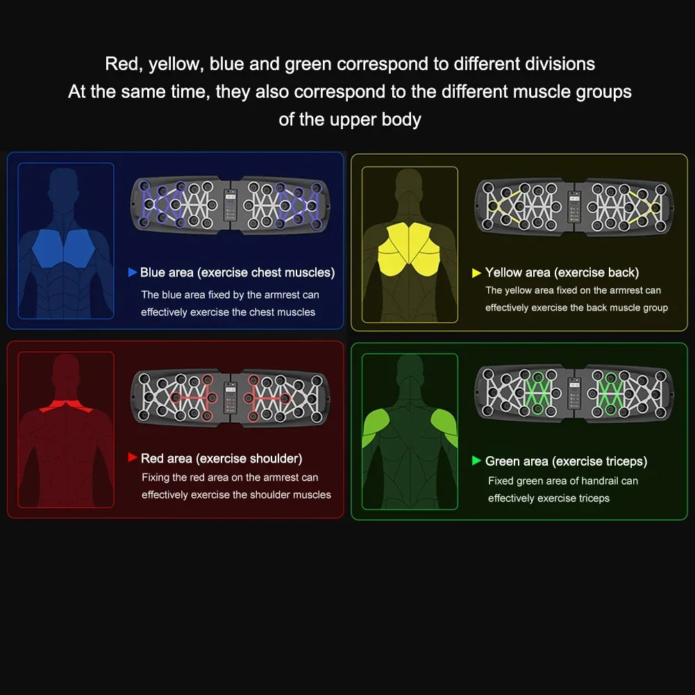 - Färgkodade guider: Hjälper enkelt att rikta in sig på bröst, triceps, rygg och core.