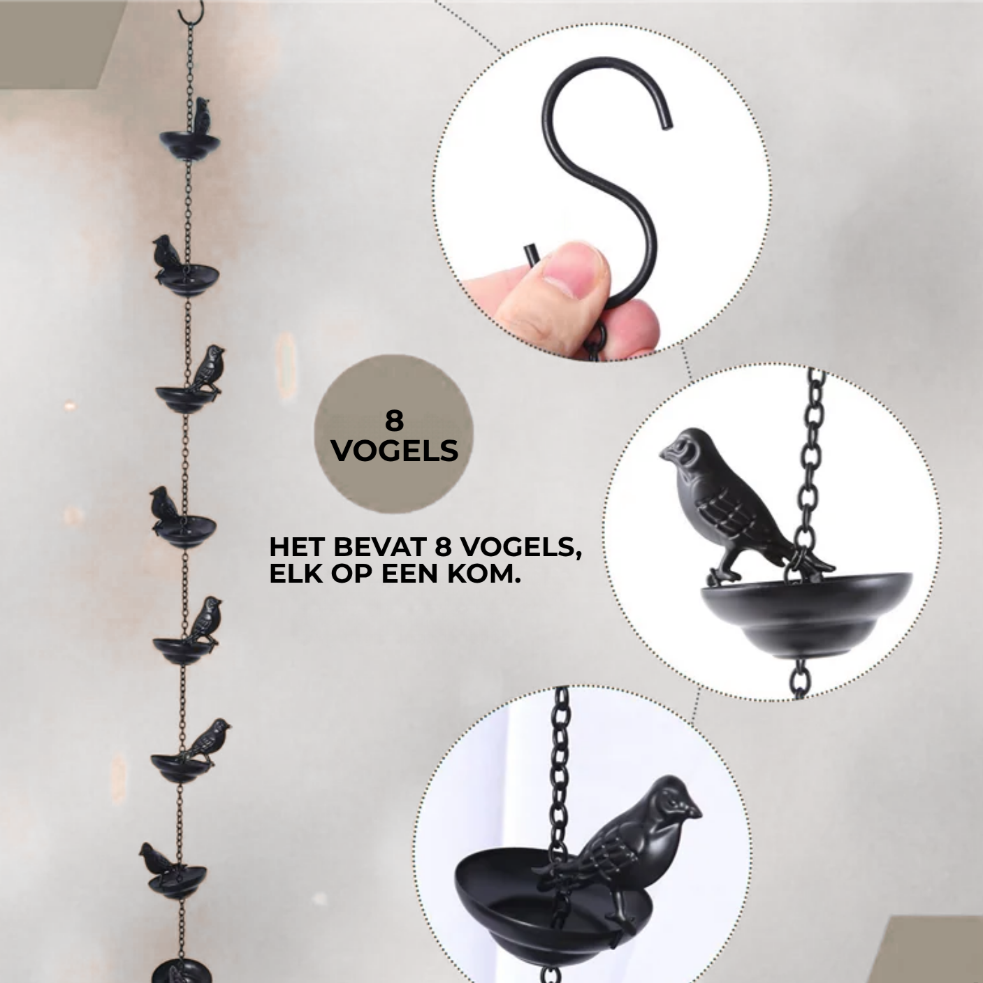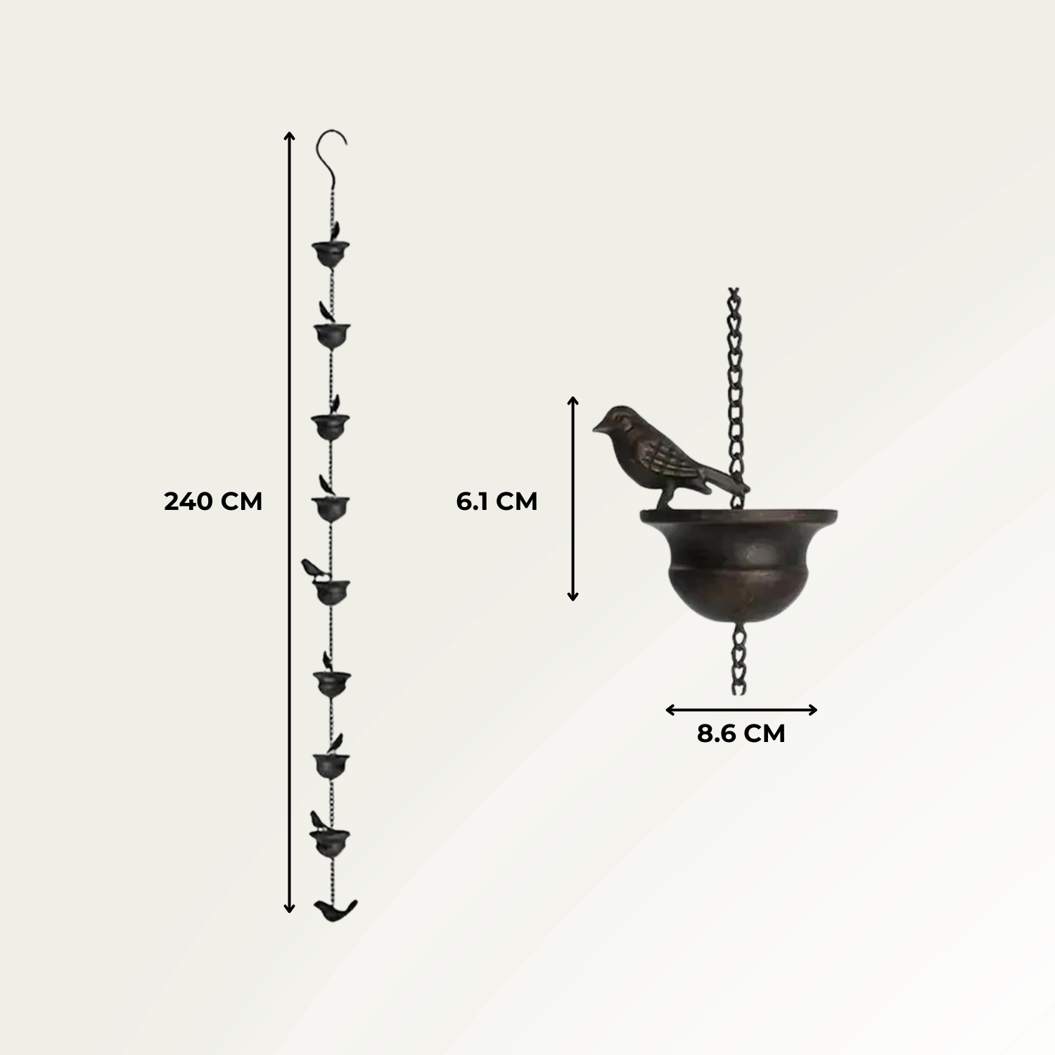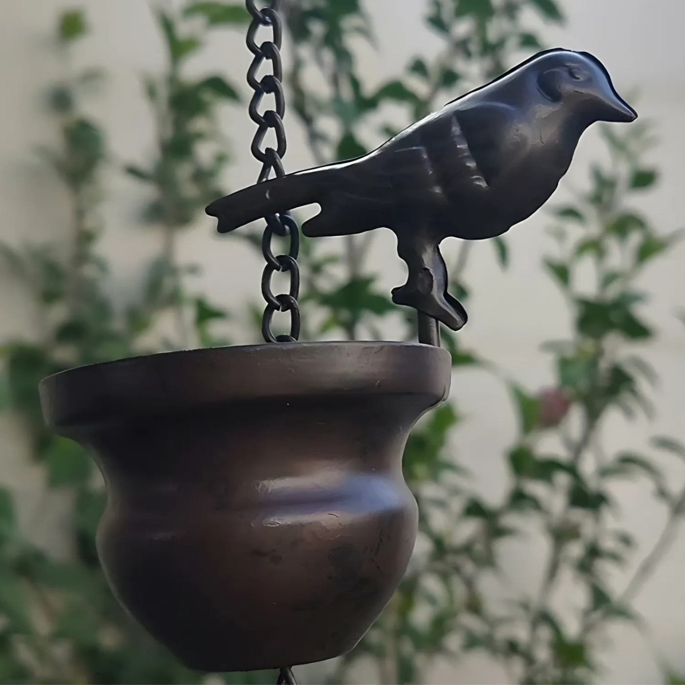 Förvandla regniga dagar till ett visuellt spektakel med RainSong-regnkedjan - ett konstnärligt alternativ till tråkiga stuprör. Med smidda metallkoppar och söta fågelfigurer rinner vattnet graciöst ner i avloppet medan du njuter av det lugnande ljudet av regndroppar.