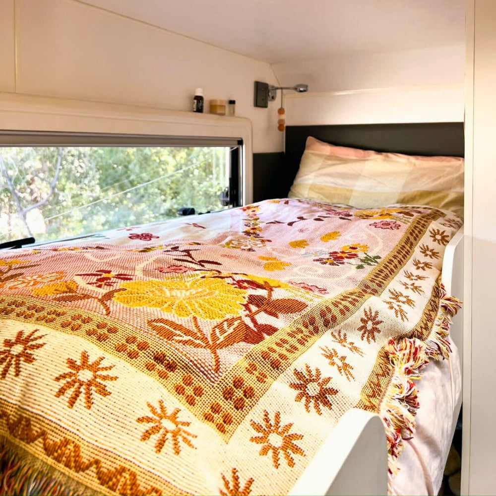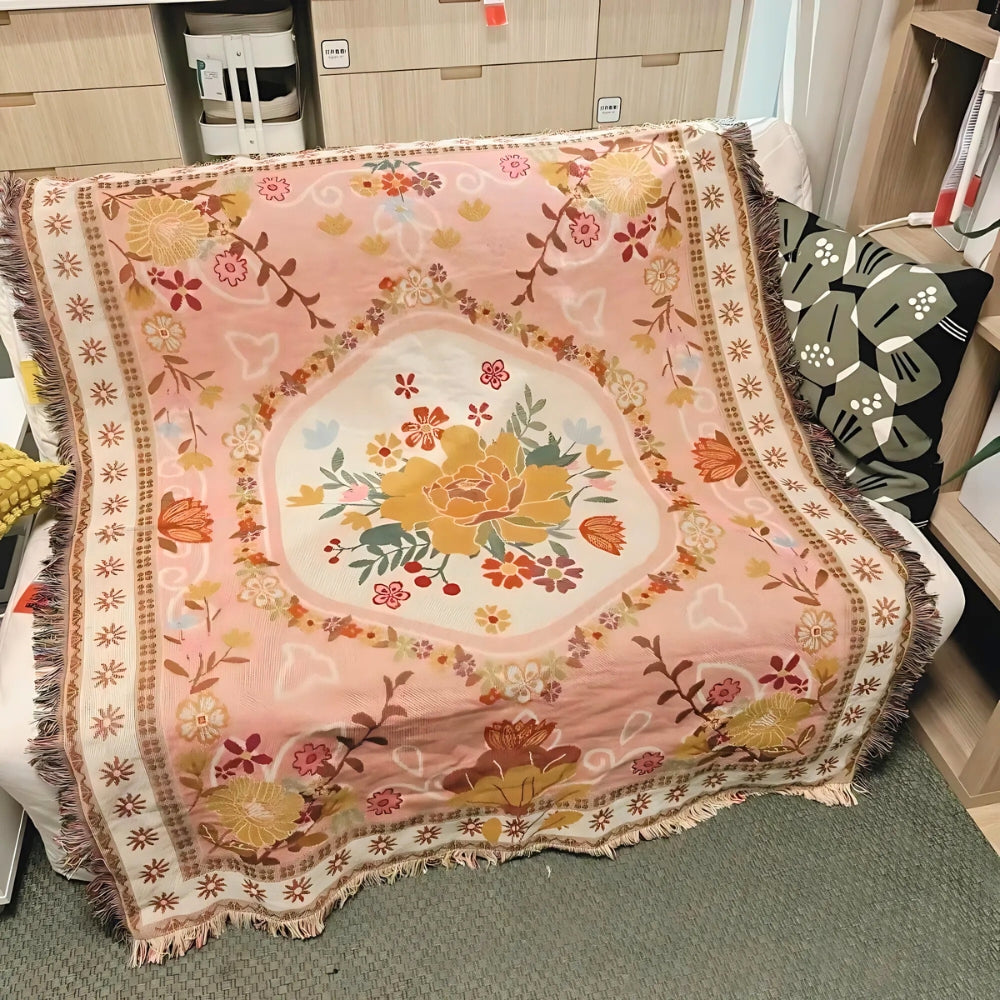Med sina mjuka blommiga toner och jacquardväv är denna helårs filt gjord för avslappnade dagar utomhus. Oavsett om du sätter upp en strandpicknick, stylat baksidan av din van, eller lägger till ett dekorativt lager på din säng, så ger denna resefilt värme, komfort och en touch av boho-romantik vart du än går.