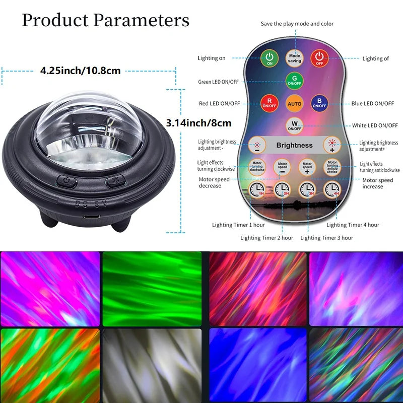 - Aurora Effekt: Flerfärgade ljus efterliknar skönheten av Norrskenet och täcker tak och väggar.