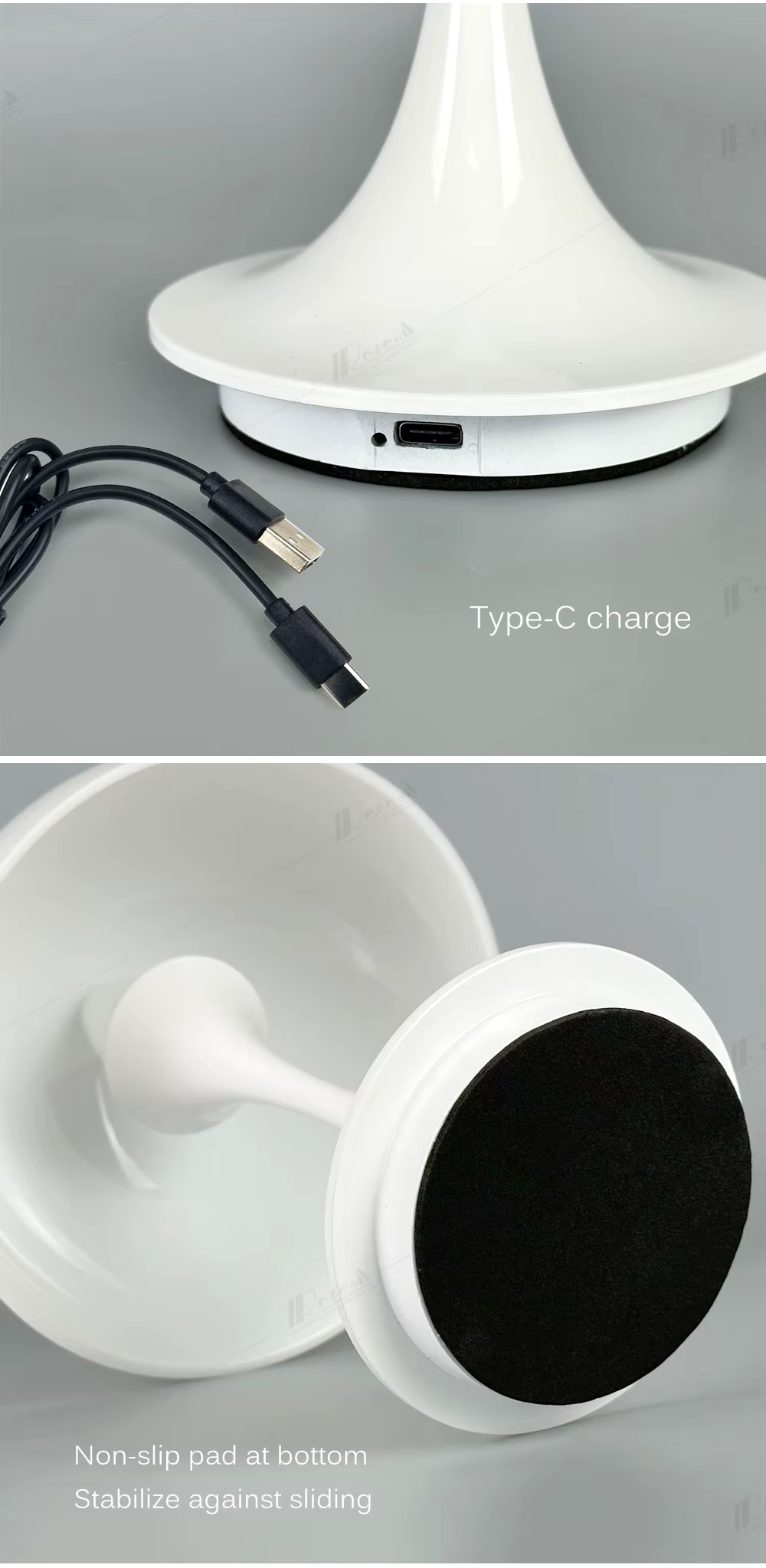 Bauhaus Retro Bordslampa förenar ikonisk design med modern funktionalitet. Denna uppladdningsbara lampa, med sin eleganta svampsiluett, erbjuder ett mjukt och inbjudande ljus till ditt nattduksbord, vardagsrum eller kontor. Tryck helt enkelt på toppen för att växla mellan varma och kalla ljusnyanser eller stänga av den. Dess kompakta och lätta design gör den till ett mångsidigt och bärbart alternativ för alla miljöer.