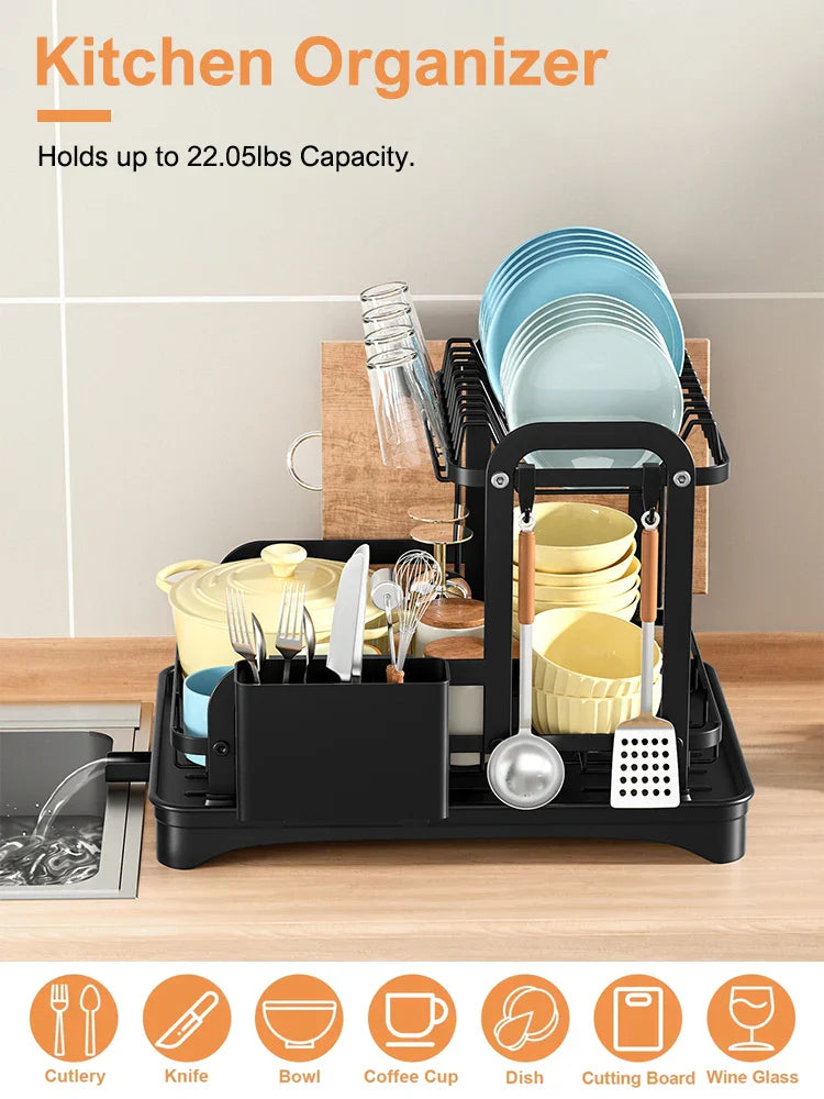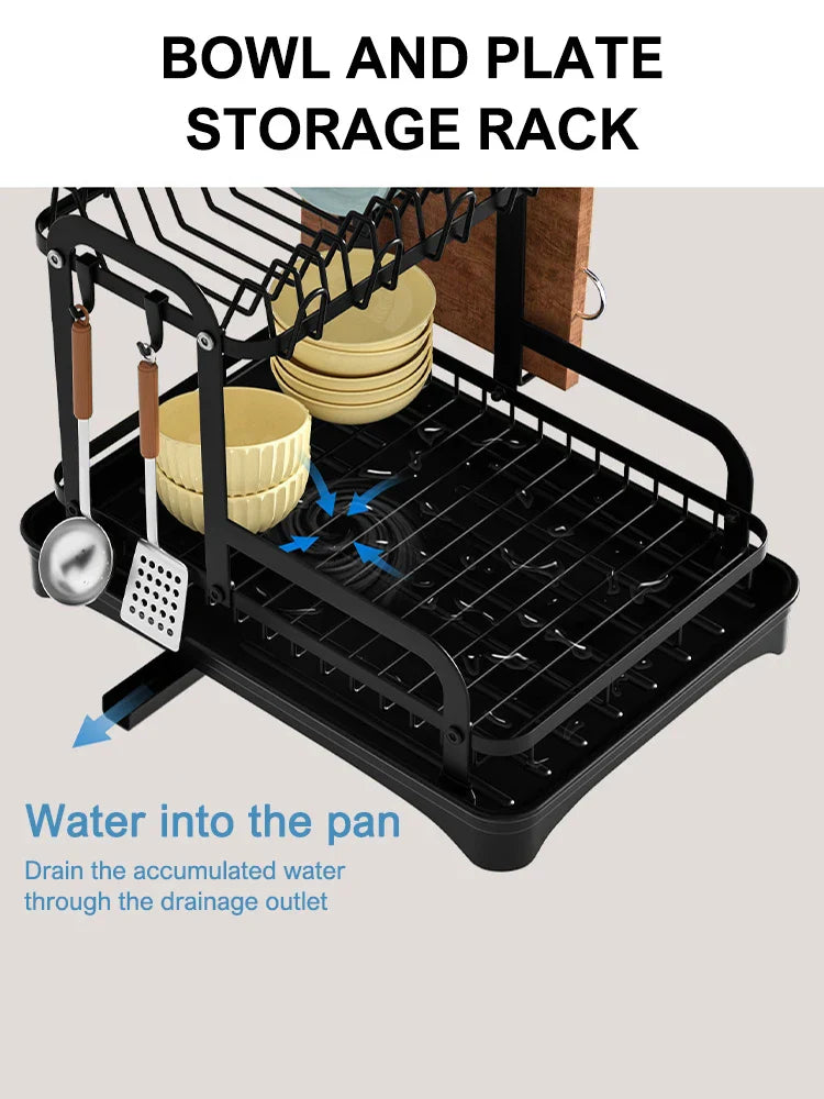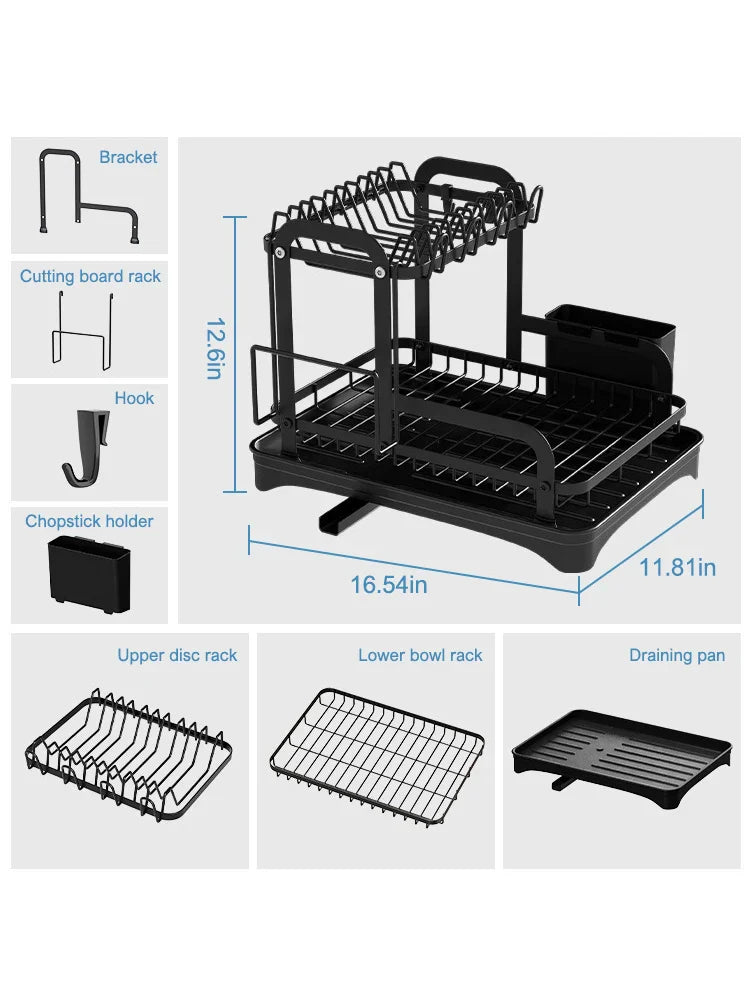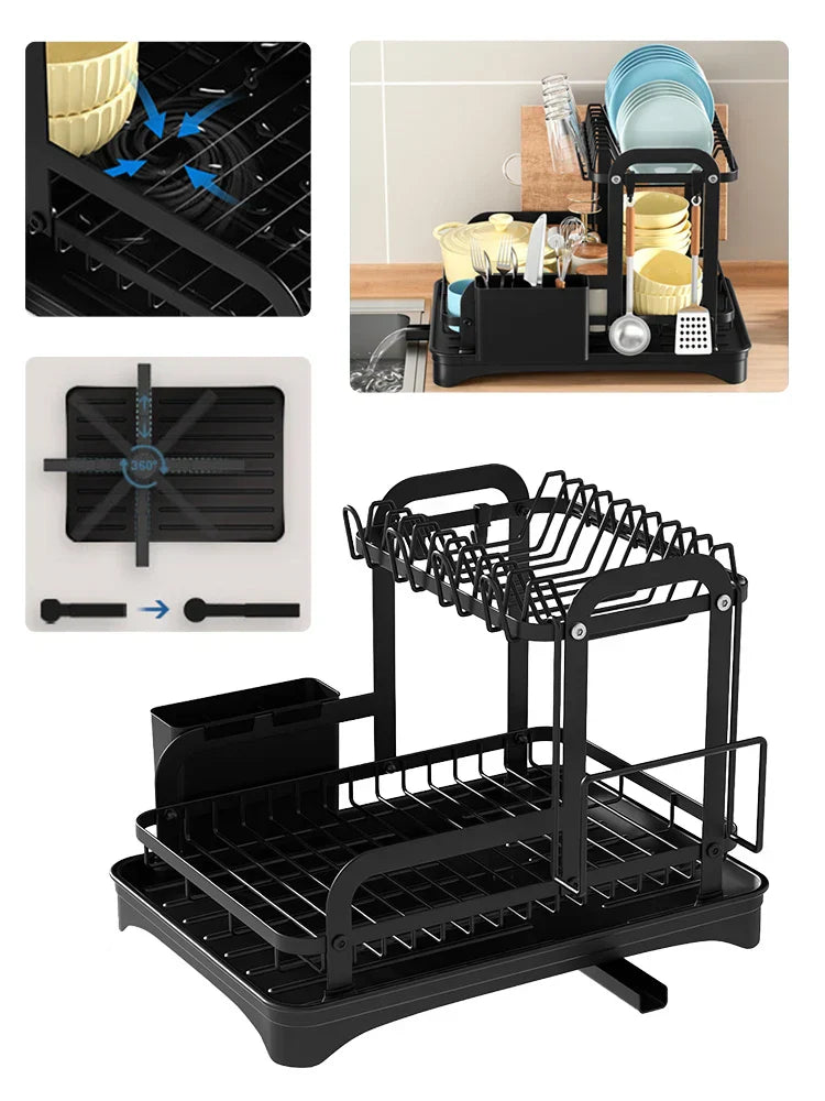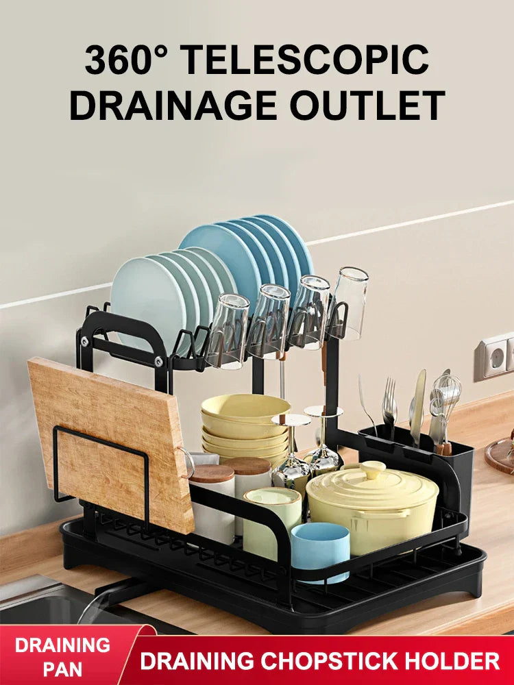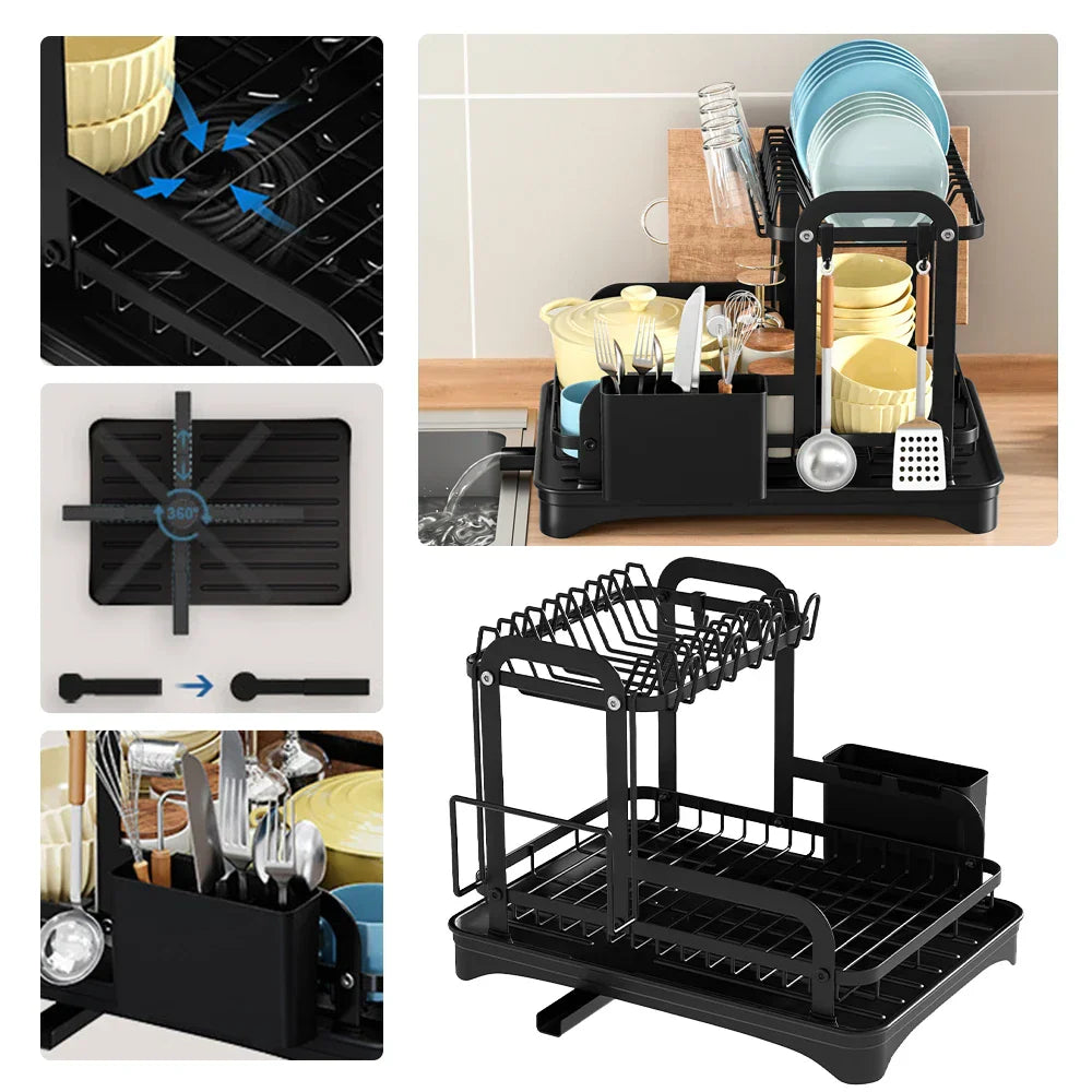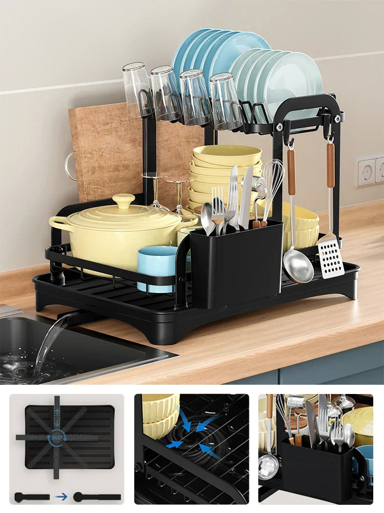 Transformera din köksupplevelse med vår innovativa 2-Tier Kök Diskställ. Utformat för att maximera utrymme och effektivitet, detta diskställ har ett 360-graders expanderbart avloppsutlopp som säkerställer grundlig dränering från varje vinkel, vilket eliminerar stillastående vatten. Säg adjö till röriga bänkskivor och hej till en renare, mer organiserad köksmiljö. Med en inbyggd avlopp och en praktisk pluggdesign är det enkelt att kontrollera vattenflödet, vilket gör att du kan upprätthålla ett prydligt utrymme medan du torkar dina diskar. Detta diskställ håller inte bara ditt serviser organiserat utan inkluderar också en bottenplatta som effektivt dränerar överskott av vatten, förhindrar uppbyggnad och främjar renlighet. Dessutom samlar den integrerade ätpinnar- hållaren vattendroppar, vilket säkerställer att din bänkskiva förblir fläckfri och utan fläckar. Höj din köksorganisation med detta stiliga och funktionella diskställ som uppfyller alla dina diskbehov.- 360-Graders Avloppsutlopp: Säkerställer effektiv dränering från alla vinklar, förhindrar vattenansamling.