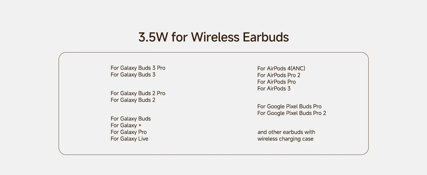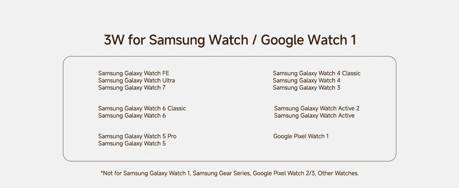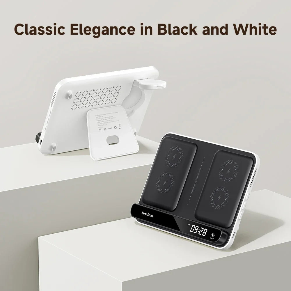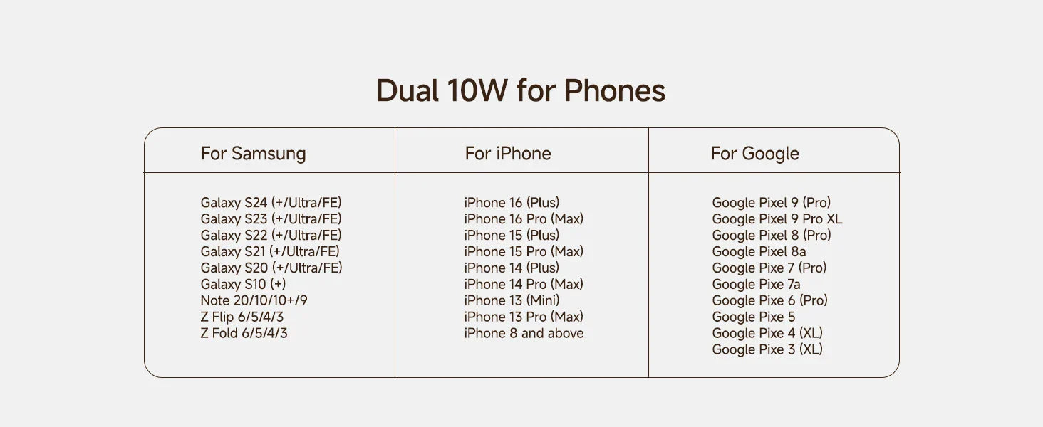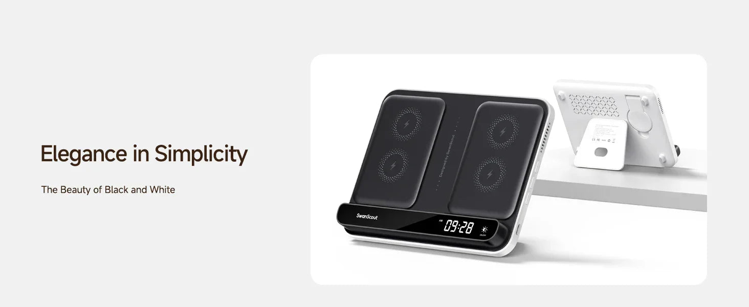 - Snabb Laddning: Levererar upp till 10W för telefoner och 3W för klockor, vilket säkerställer att dina enheter laddas snabbt och effektivt.