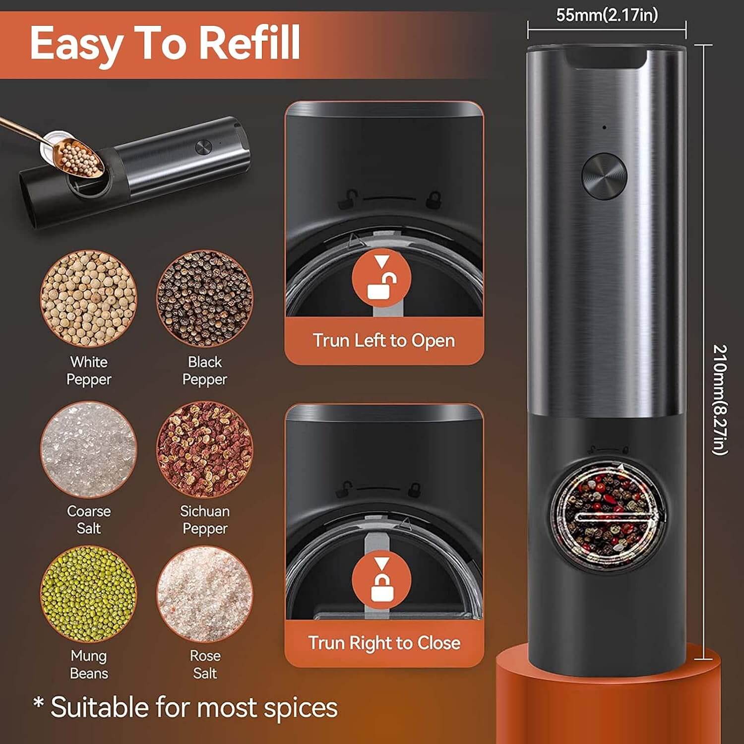 - LED-lampa: Inbyggd belysning säkerställer att du kryddar med noggrannhet när som helst på dagen.