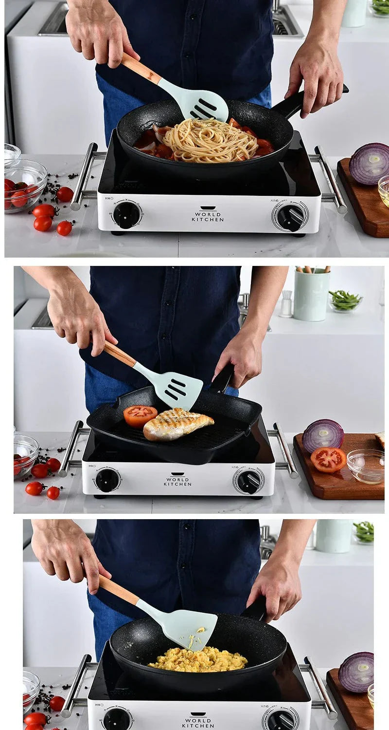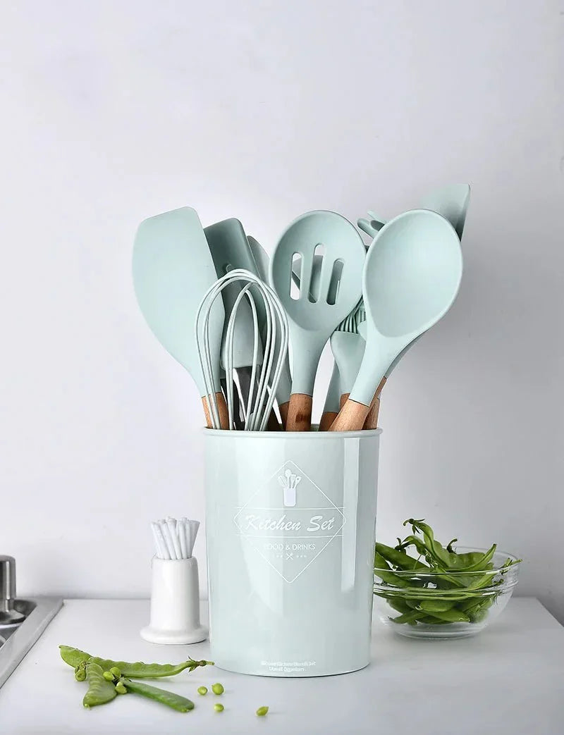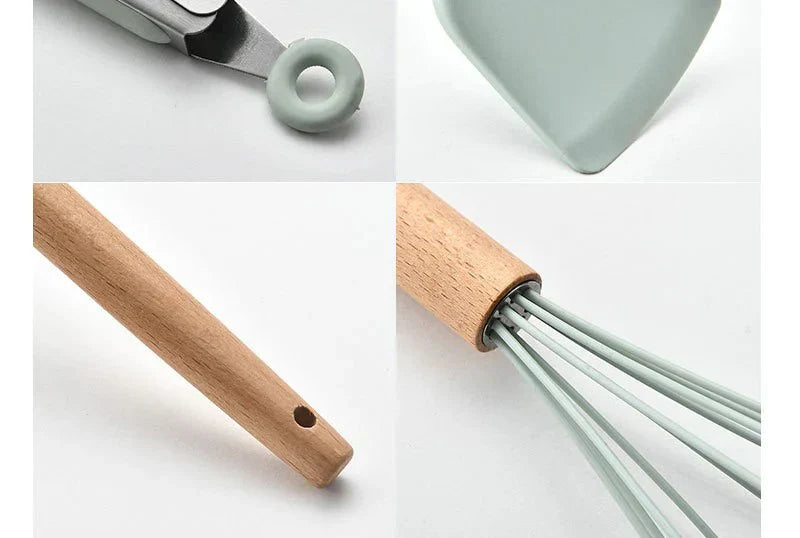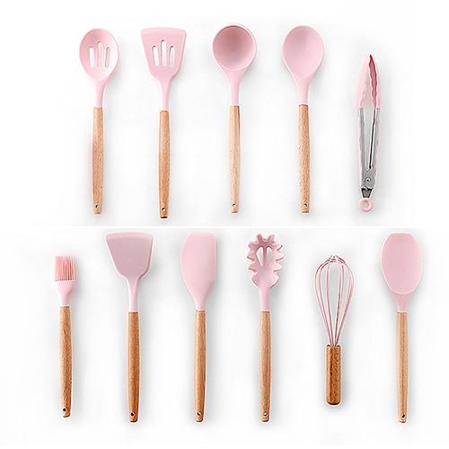 - Paketet Innehåller: 1 Kökstillbehörs Set (inklusive spatel, basterborste, spetsig spatel, rund-kant vändare, slev, rak-kant vändare, sked, tång, pastagaffel)