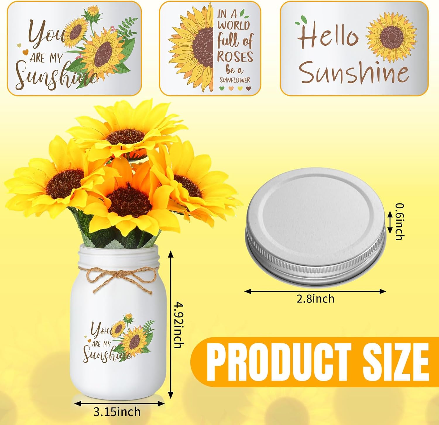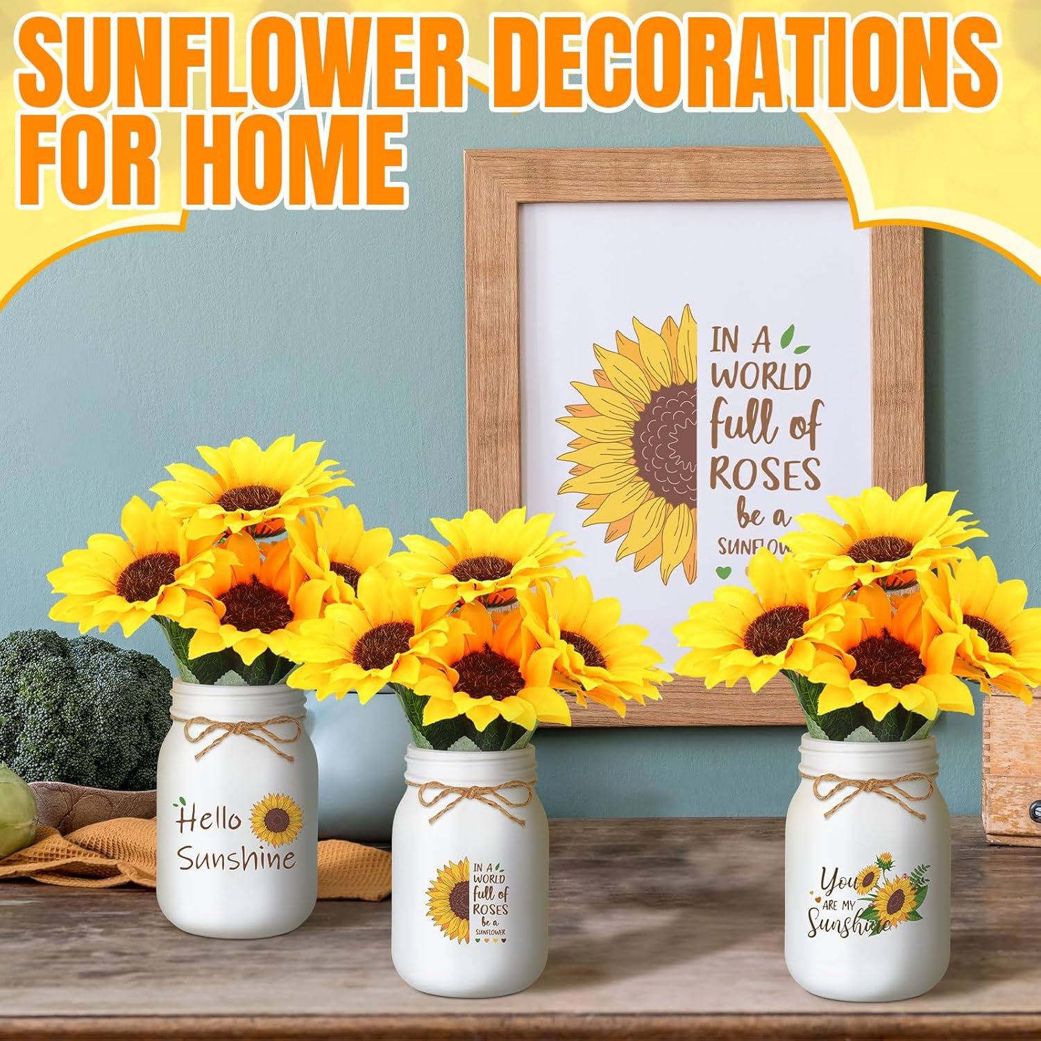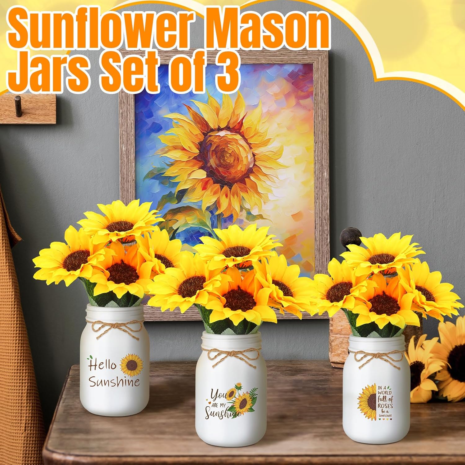 Ta med solsken inomhus med detta set med 3 solrosor i masonburkar! Med tre vackert texturerade vita glasburkar bundna med juterosetter och i kombination med färgglada konstgjorda solrosknippen utstrålar detta set värme, glädje och lantlig charm. Perfekt för sommarbordsdekorationer, bröllop eller vardagsbruk, ger dessa mångsidiga delar en mysig, rustik touch till vilket utrymme som helst.