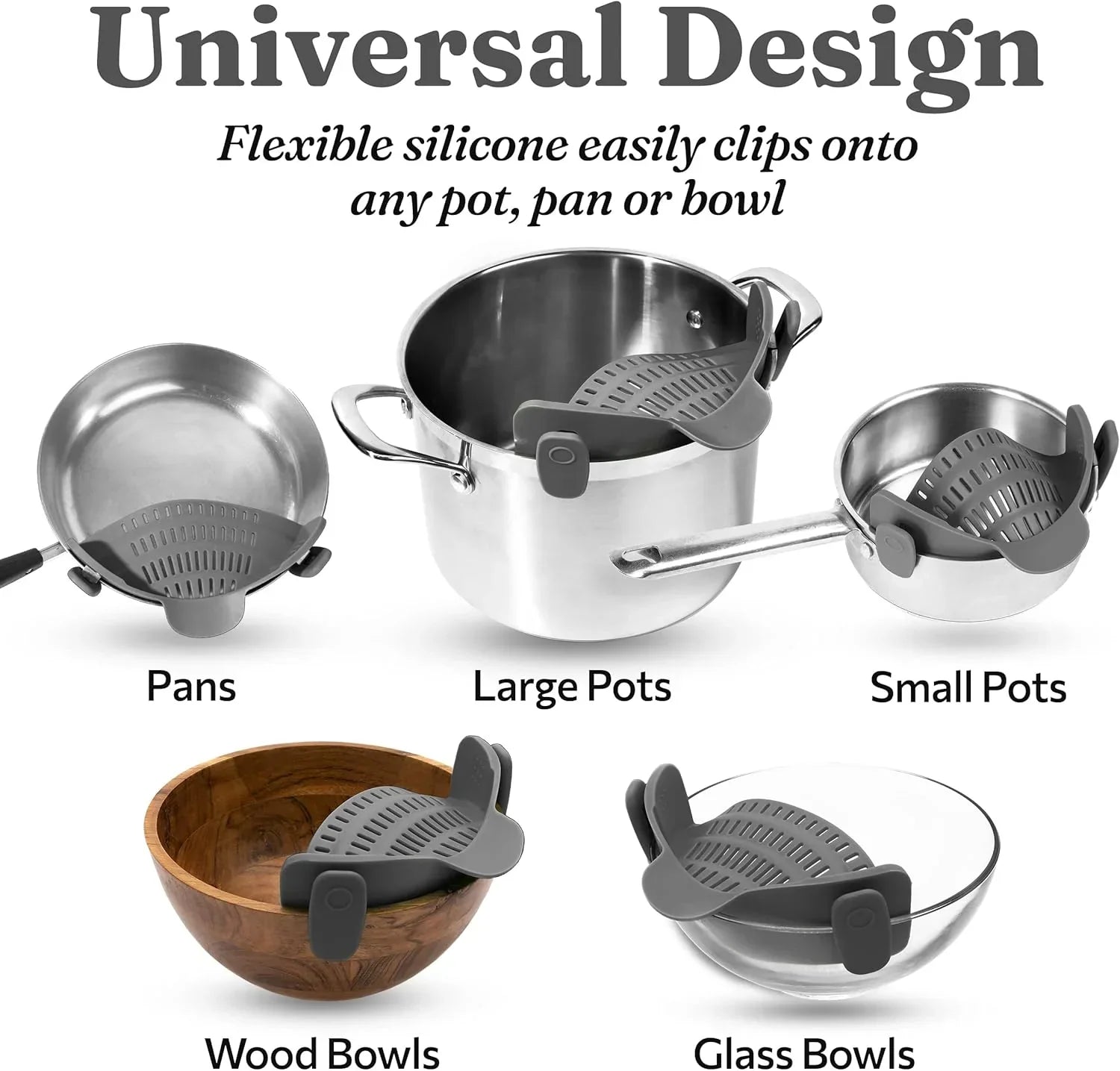 Glöm krångliga sil och spillt vatten i köket! Silikon-silen med klämma gör det enklare än någonsin att hälla av pasta, grönsaker eller ris. Den fästs direkt på kastrullens kant, sitter säkert och säkerställer att du kan hälla av utan ansträngning – helt utan att behöva hälla om.