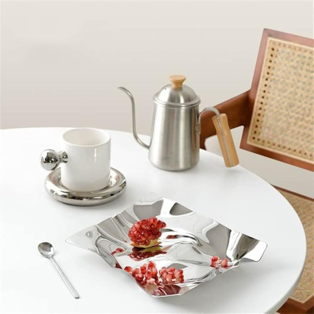 Höj din inredning med trayen i rostfritt stål med en rynkad design. Med en fantastisk spegelslät yta och en dramatisk rynkad design, kombinerar denna tray konstnärlighet med praktiskhet, vilket gör den perfekt för att visa upp småsaker, smycken eller som en ensamstående statementbit.