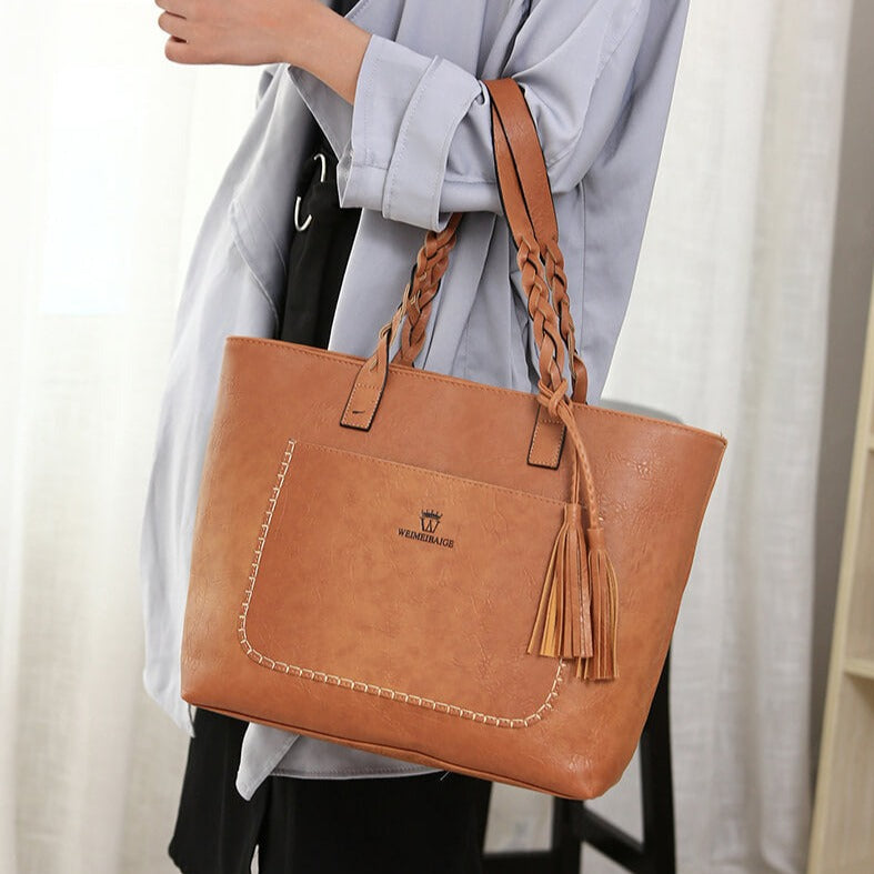 - Rymlig: Den har en innerficka och en blixtlåsficka. Det finns också en utvändig slitsficka för extra utrymme. De två flätade PU-läderremmarna gör väskan unik.