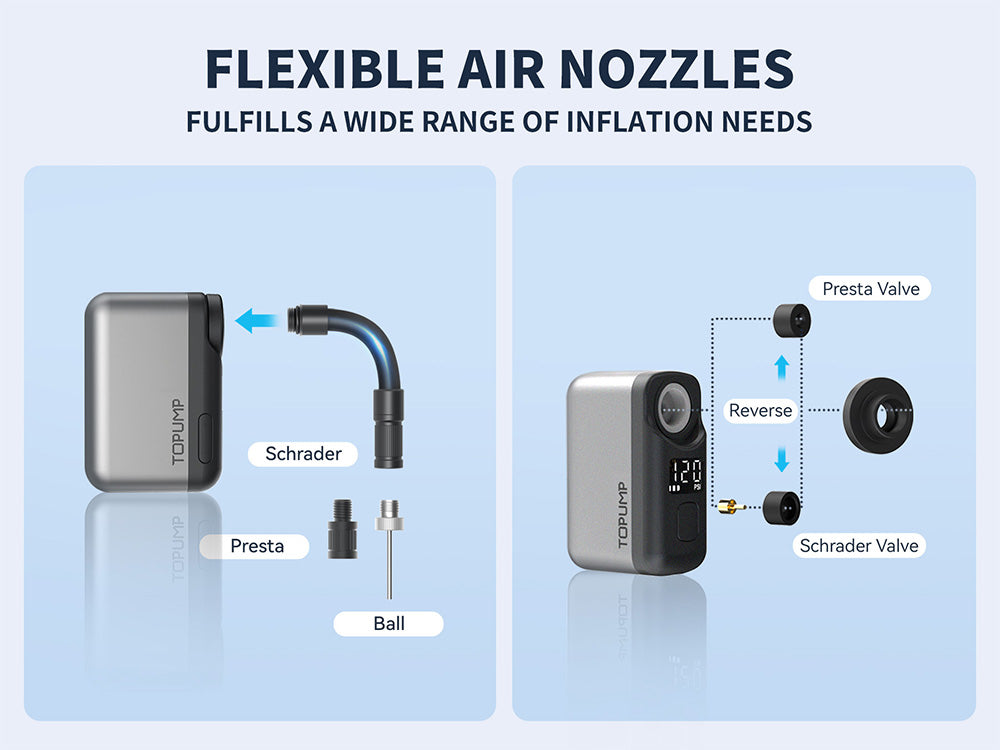 Designad med flexibla luftmunstycken är denna minicykelpump kompatibel med Schrader, Presta och bollaruppblåsare. Oavsett om du pumpar upp däck på landsvägscyklar, mountainbikes eller sportutrustning, så säkerställer den anpassningsbara designen sömlös uppblåsning.