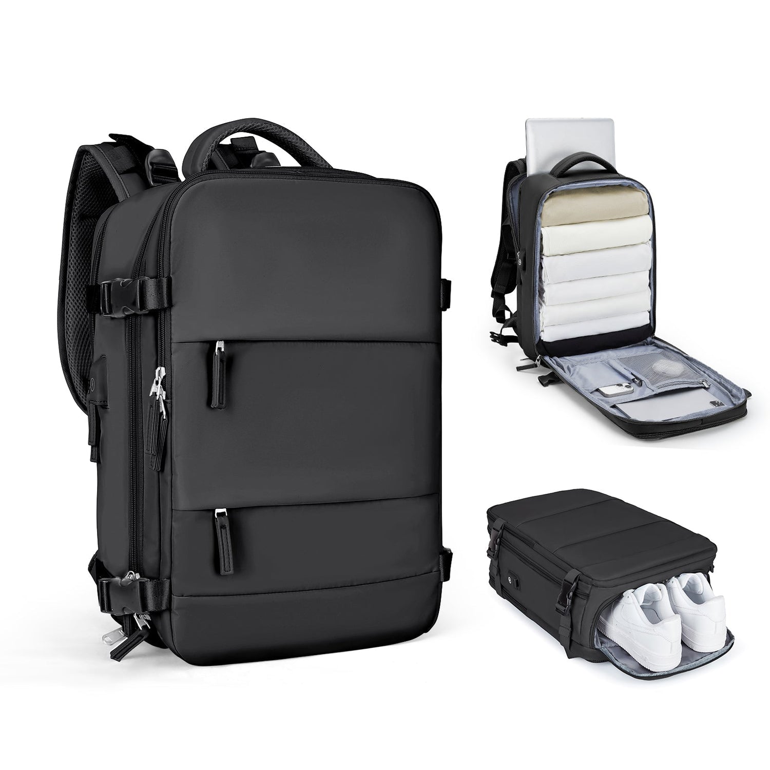 Överskrider traditionella alternativ med en kapacitet på 45L, uppfyller flygbolagens godkända storlekskrav. Lätt som en handväska men med lagringskapacitet som en liten resväska, väger vår utvidgningsbara ryggsäck bara 1,3 kg, vilket lovar en problemfri reseupplevelse utan att kompromissa med utrymmet.