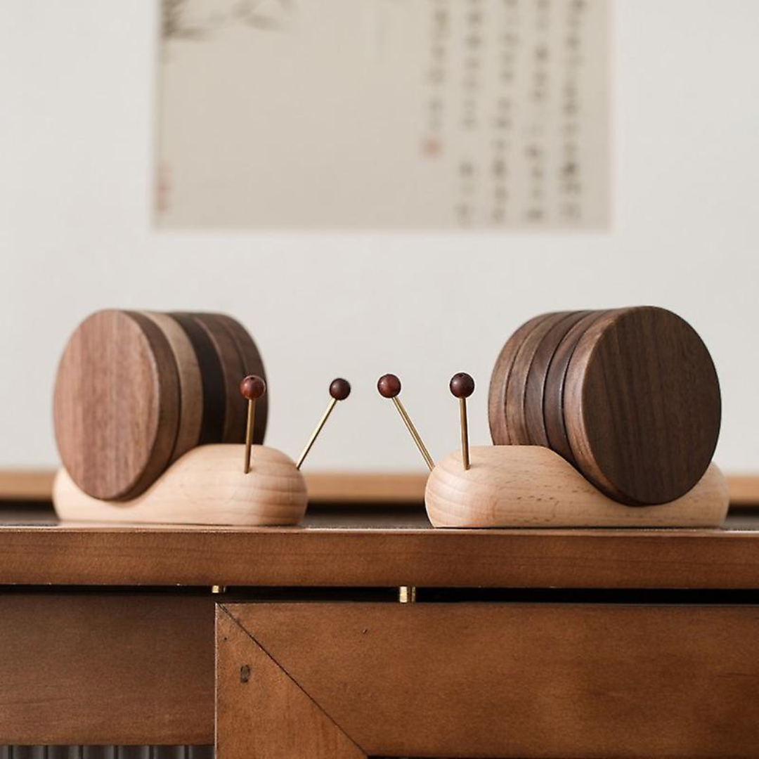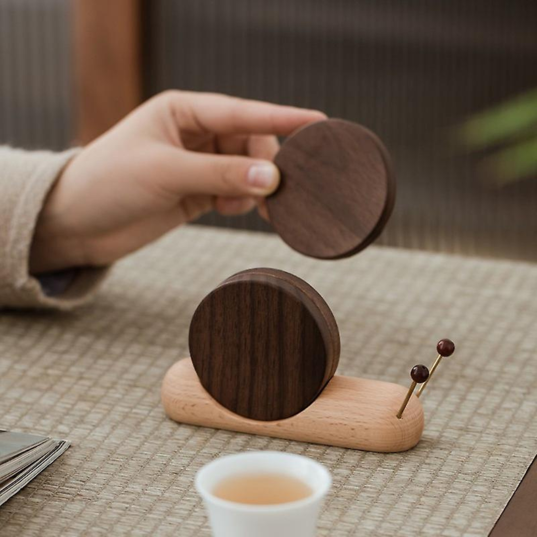 Få både funktion och skönhet med vårt unika Snigelset tillverkat av valnötsträ. Dessa glasunderlägg kan enkelt staplas ihop för att skapa en charmig och dekorativ snigel när de inte används. Perfekt för att skydda dina ytor från spill och märken samtidigt som du tillför en lekfull detalj till ditt hem.