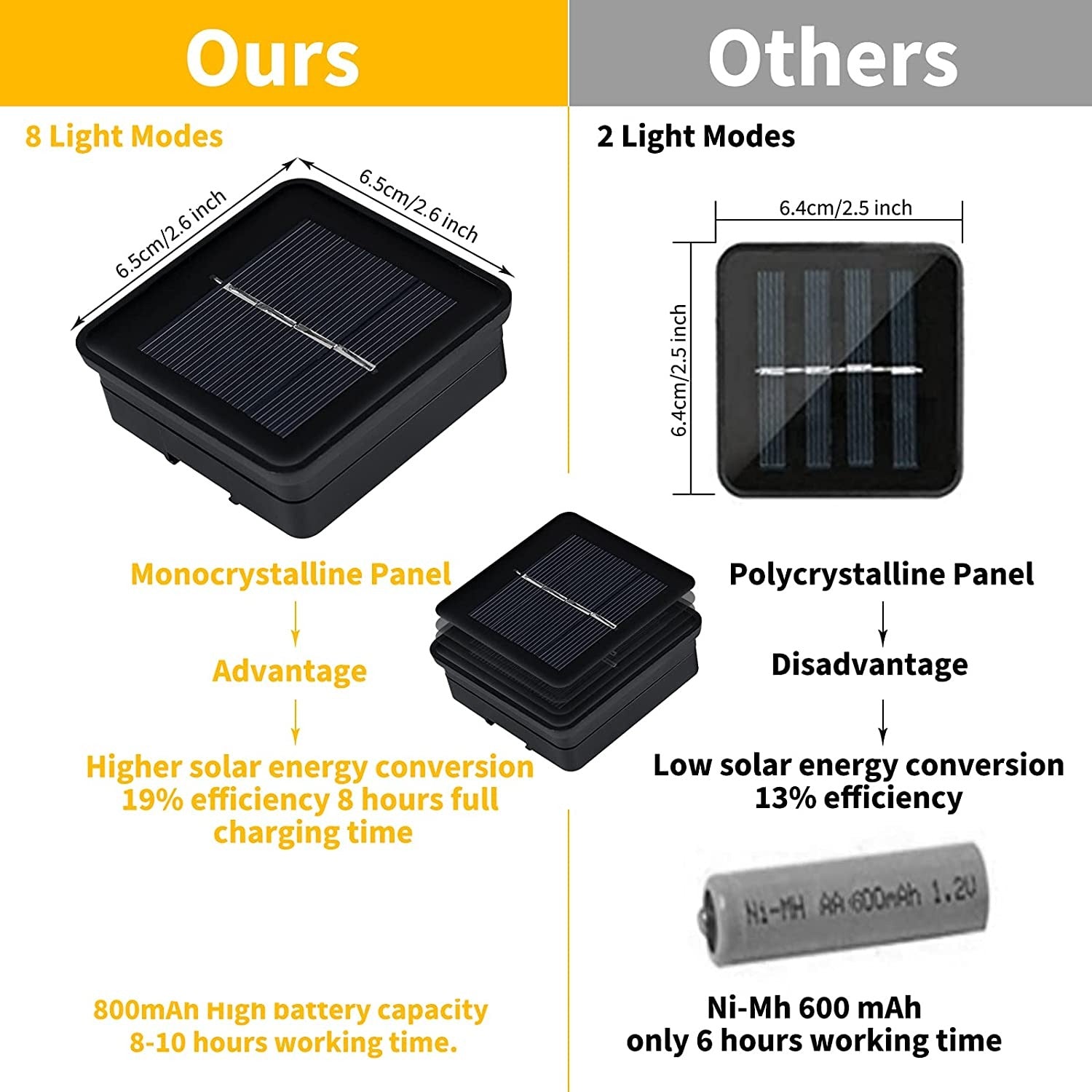 - Effektiv solenergiladdning: Utrustad med ett 800mAh uppladdningsbart batteri, erbjuder dessa lampor upp till 8-10 timmars belysning efter en full dags laddning.
