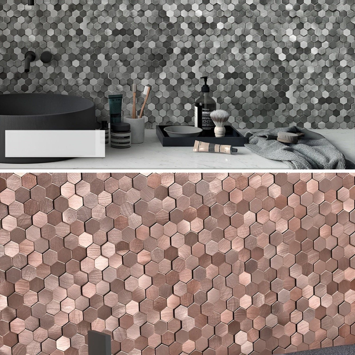 Med SplashSafe Stickers behöver du inte kompromissa med stil för funktion. Det hexagonala mosaikmönstret ger en modern känsla medan det robusta, hållbara materialet är oöverträffat i praktikalitet. Säg adjö till tråkiga väggar och välkomna ett stiligt, sofistikerat rum!