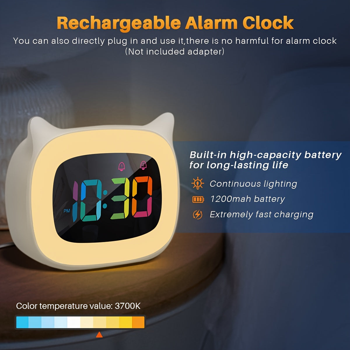 Denna söta väckarklocka med kattöron är mer än bara en väckarklocka – det är också en mysig nattlampa. Den LED-displayen visar inte bara tiden utan låter dig också växla mellan 7 olika färger för en lugnande nattlampa. Väckarklockan har 18 melodier, så du kan vakna varje morgon till ett ljud av ditt val. Lysstyrkan och volymen är lätta att justera, och tack vare USB-laddningsfunktionen kan du enkelt ladda klockan med det medföljande litiumbatteriet, som också ingår. Mångsidigheten och den roliga designen gör denna väckarklocka till ett perfekt val för ett barnrum eller som festdekoration.